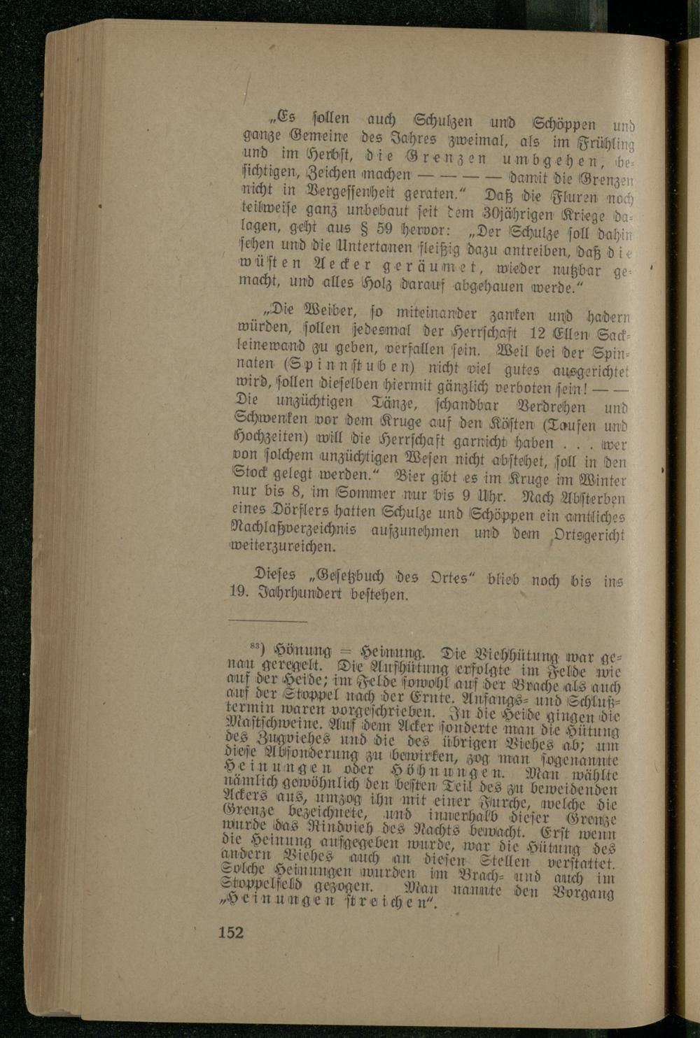 *) Hönung= Heinung. Die Viehhütung war ge— nau geregelt. Die Aufhütung erfolgte im Felde wie auf der Heide; im Felde ſo wohl auf der Brache als auch auf der Stoppel nach der Ernte. Anfangs⸗ und Schlußtermin waren vorgeſchrieben. In die Heide gingen die Maſtſchweine. Auf dem Acker ſonderte man die Hütung des Zugviehes und die des übrigen Viehes ab; um dieſe Abſonderung zu bewirken, zog man ſogenannte Hein ungen oder H öhnungen. Man wählte nämlich gewöhnlich den beſten Teil des zu beweidenden Ackers aus, umzog ihn mit einer Furche, welche die Grenze bezeichnete, und innerhalb dieſer Grenze wurde das Rindvieh des Nachts bewacht. Erſt wenn die Heinung aufgegeben wurde, war die Hütung des andern Viehes auch an dieſen Stellen verſtattet. Solche Heinungen wurden im Brach⸗ und auch im Stoppelfeld gezogen. Man nannte den Vorgang „Heinungen rei che n“.