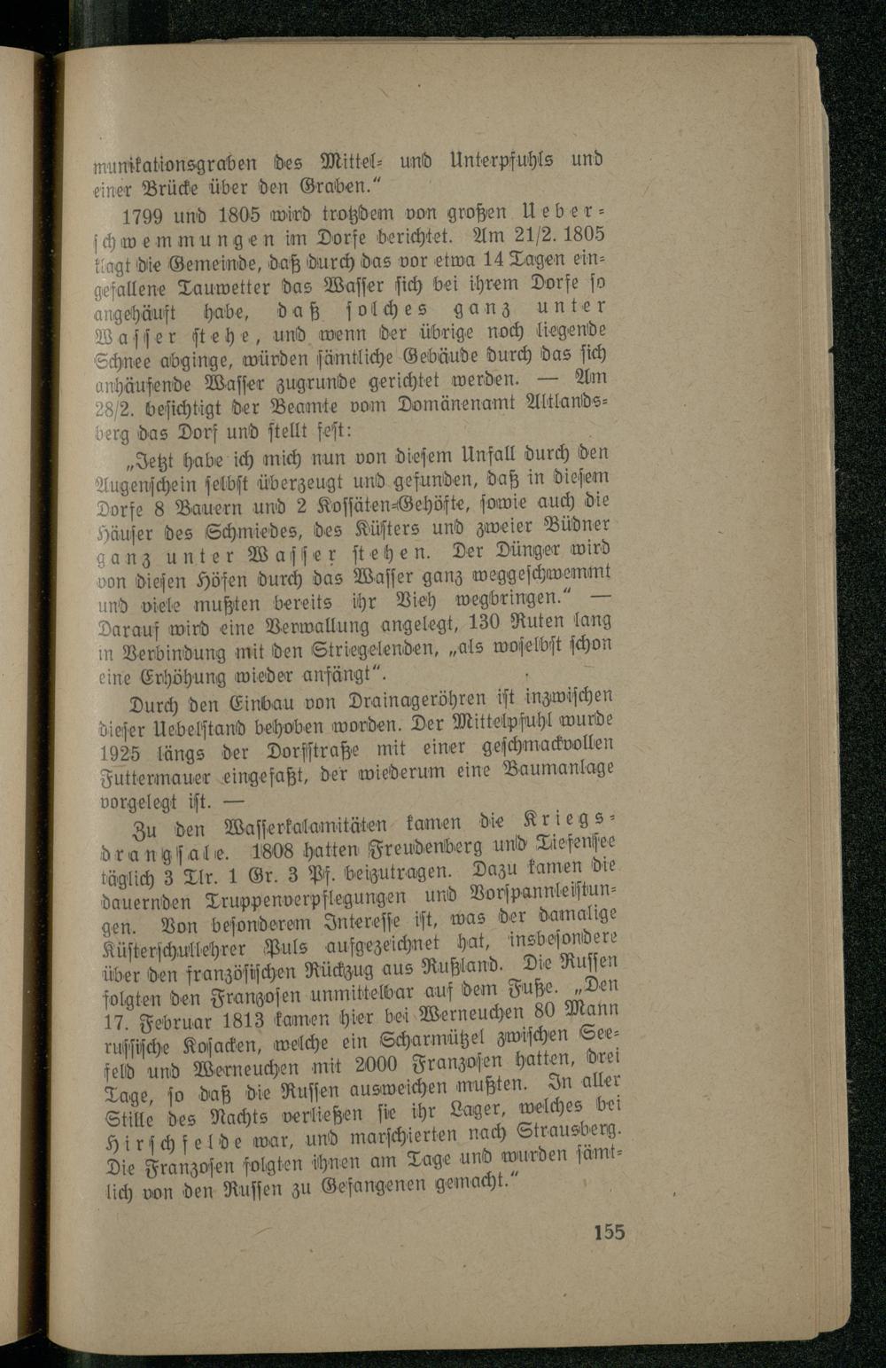Zu den Waſſerkalamitäten kamen die Krieg sdrangſalſe. 1808 hatten Freudenberg und Tiefenſee täglich 3 Tlr. 1 Gr. 3 Pf. beitzutragen. Dazu kamen die dauernden Truppenverpflegungen und Vorſpannleiſtungen. Von beſonderem Intereſſe iſt, was der damalige Küſterſchullehrer Puls aufgezeichnet hat, insbeſondere über den franzöſiſchen Rückzug aus Rußland. Die Ruſſen folgten den Franzzoſen unmittelbar auf dem Fuße.„Den 17. Februar 1813 kamen hier bei Werneuchen 80 Mann ruſſiſche Koſacken, welche ein Scharmützel zwiſchen Seefeld und Werneuchen mit 2000 Franzoſen hatten, drei Tage, ſo daß die Ruſſen ausweichen mußten. In aller Stille des Nachts verließen ſie ihr Lager, welches bei Hirſchfelde war, und marſchierten nach Strausberg. Die Franzoſen folgten ihnen am Tage und wurden ſämtlich von den Ruſſen zu Gefangenen gemacht.“