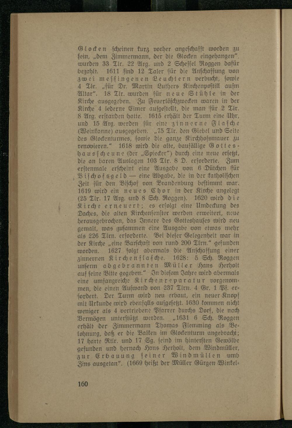 Glocken ſcheinen kurz vorher angeſchafft worden zu ſein,„dem Zimmermann, der die Glocken eingehangen“, wurden 33 Tlr. 22 Arg. und 2 Scheffel Roggen dafür bezahlt. 1611 ſind. Taler für die Anſcha ffung von zwei meſſingenen Leuchtern verbucht, ſowie 4 Tr. für Dr. Martin Luthers Kirchenpoſtill um Altar“. 18 Tlr. wurden für neue Stühle in der Kirche K Zu Feuerlöſchzwecken waren in der Kirche 4 lederne Eimer aufgeſtellt, die man für 2 Tlr 8 Arg. erſtanden hatte. 1615 erhält der Turm eine Uhr, und 15 Arg. werden ſür eine zinnerne Flaſche (Weinkanne) ausgegeben.„I5 Tlr. den Giebel und Seite des Glockenturmes, ſowie die ganze Kirchhofsmauer zu renovieren.“ 1618 wird die alte, baufällige Gotteshausſcheune(der„Spiecker“) durch eine neue erſetzt, die an baren Auslagen 103 Tlr. 8 D. erforderte. Zum erſtenmale erſcheint eine Ausgabe won 6 Dütchen für Biſchofsgeld— eine Abgabe, die in der katholiſchen Zeit für den Biſchof von Brandenburg beſtimmt war. 1619 wird ein neues Chor in der Kirche angelegt (25 Tlr. 17 Arg. und 8 Sch. Roggen). 1620 wird die Kirche erneuert; es erfolgt eine Umdeckung des Daches, die alten Kirchenfenſter werden erweitert, neue herausgebrochen, das Innere des Gotteshauſes wird neu gemalt, was zuſammen eine Ausgabe von etwas mehr als 226 Tlrn. erforderte. Bei dieſer Gelegenheit war in der Kirche„eine Barſchaft von rund 200 Tirn.“ gefunden worden. 1627 folgt abermals die Anſchaffung einer zinnernen Kirchenflaſche. 1628: 5 Sch. Roggen unſerm abgebrannten Müller Hans herholt auf ſeine Bitte gegeben.“ In dieſem Jahre wird abermals eine umfangreiche Kir chen reparatur vorgenommen, die einen Aufwand von 237 Tlrn. 4 Gr. 1 Pf. erſordert. Der Turm wird neu erbaut, ein neuer Knopf mit Urkunde wird ebenfalls aufgeſetzt. 1630 kommen 363 weniger als 4 wertriebene Pfarrer durchs Dorf, die na Vermögen unterſtüßßt werden.„1631 6 Sch. ö erhält der Zimmermann Thomas Flemming als Belohnung, daß er die Balken im Glockenturm angebracht; 17 harte Rtlr. und 17 Sg. ſeind im hinterſten Gewölbe gefunden und hernach Sons Herholt, dem Windmüller, zur Erbauung feiner Wind müllen umb Zins ausgetan“.(1669 heißt der Müller Gürgen Winkel