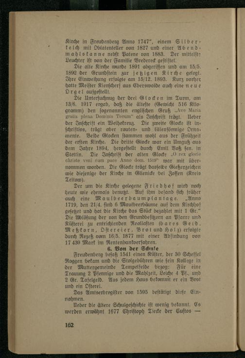 Freudenberg beſaß 1541 einen Küſter, der 30 Scheffel Roggen bekam und die Stolgebühren wie ſein Kollege in der Muttergemeinde Tempelfelde bezog: Für eine Trauung 2 Pfennige und die Mahlzeit, Leiche 4 Pf., und 2 Gr. Tafelgeld. Aus jedem Haus bekomnit er ein Brot und ein Oſterei.