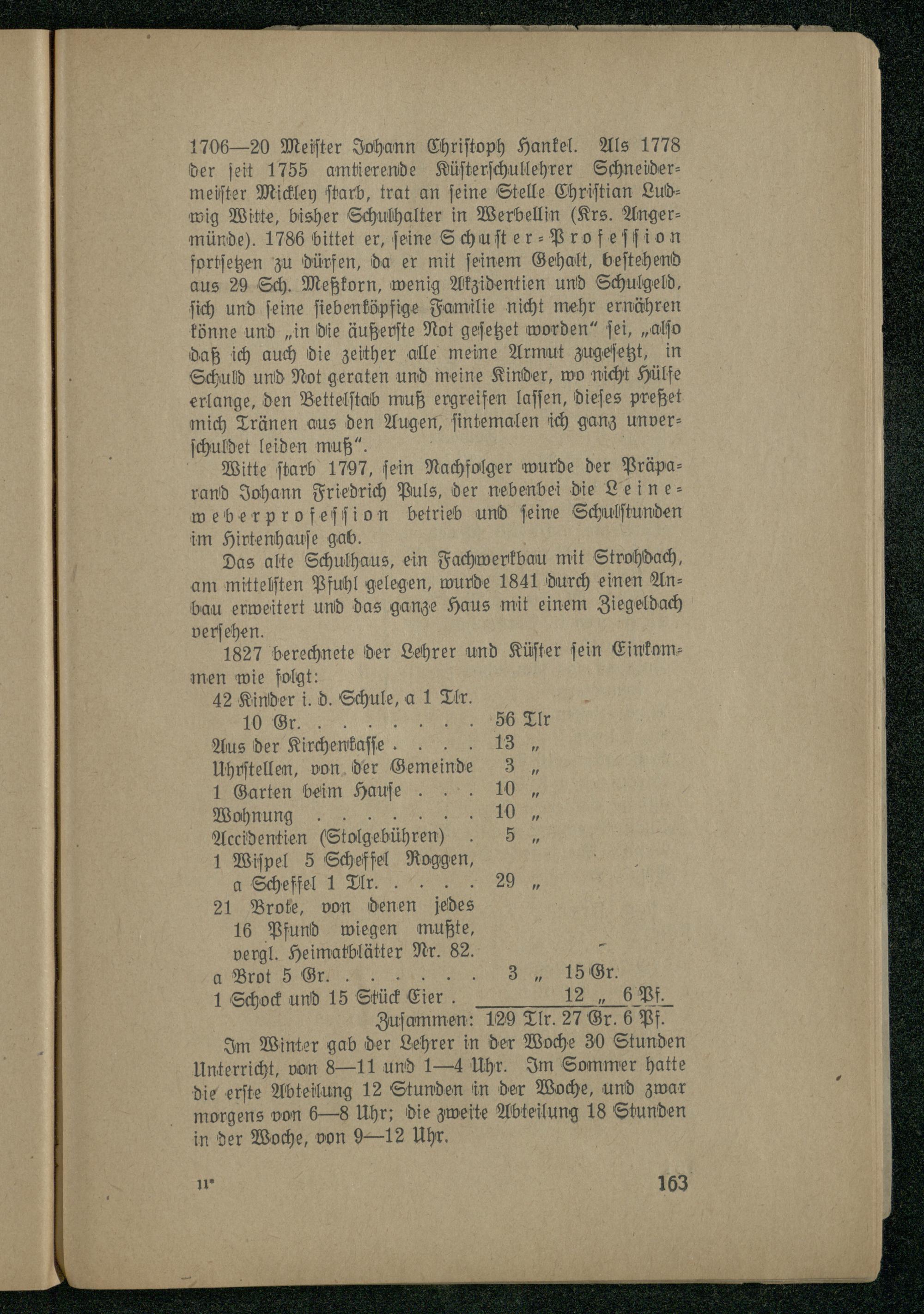 1827 berechnete der Lehrer und Küſter ſein Einkommen wie folgt: