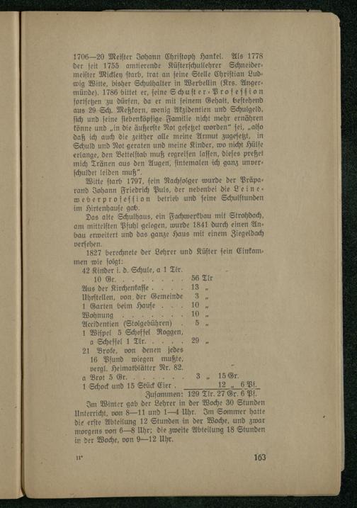 1706—20 Meiſter Johann Chriſtoph Hankel. Als 1778 der ſeit 1755 amtierende Küſterſchullehrer Schneidermeiſter Mickley ſtarb, trat an ſeine Stelle Chriſtian Ludwig Witte, bisher Schulhalter in Werbellin(Krs. Angermünde). 1786 bittet er,[eine Schuſter⸗Profeſſion fortſetzen zu dürfen, da er mit ſeinem Gehalt, beſtehend aus 29 Sch. Meßkorn, wenig Akzidentien und Schulgeld, ſich und feine ſieben köpfige Familie nicht mehr ernähren könne und„in die äußerſte Not geſetzet worden“ ſei,„alſo daß ich auch die zeither alle meine Armut zugeſetzt, in Schuld und Not geraten und meine Kinder, wo nicht Hülfe erlange, den Bettelſtab muß ergreifen laſſen, dieſes preßet mich Tränen aus den Augen, ſintemalen ich ganz unverſchuldet leiden muß“.