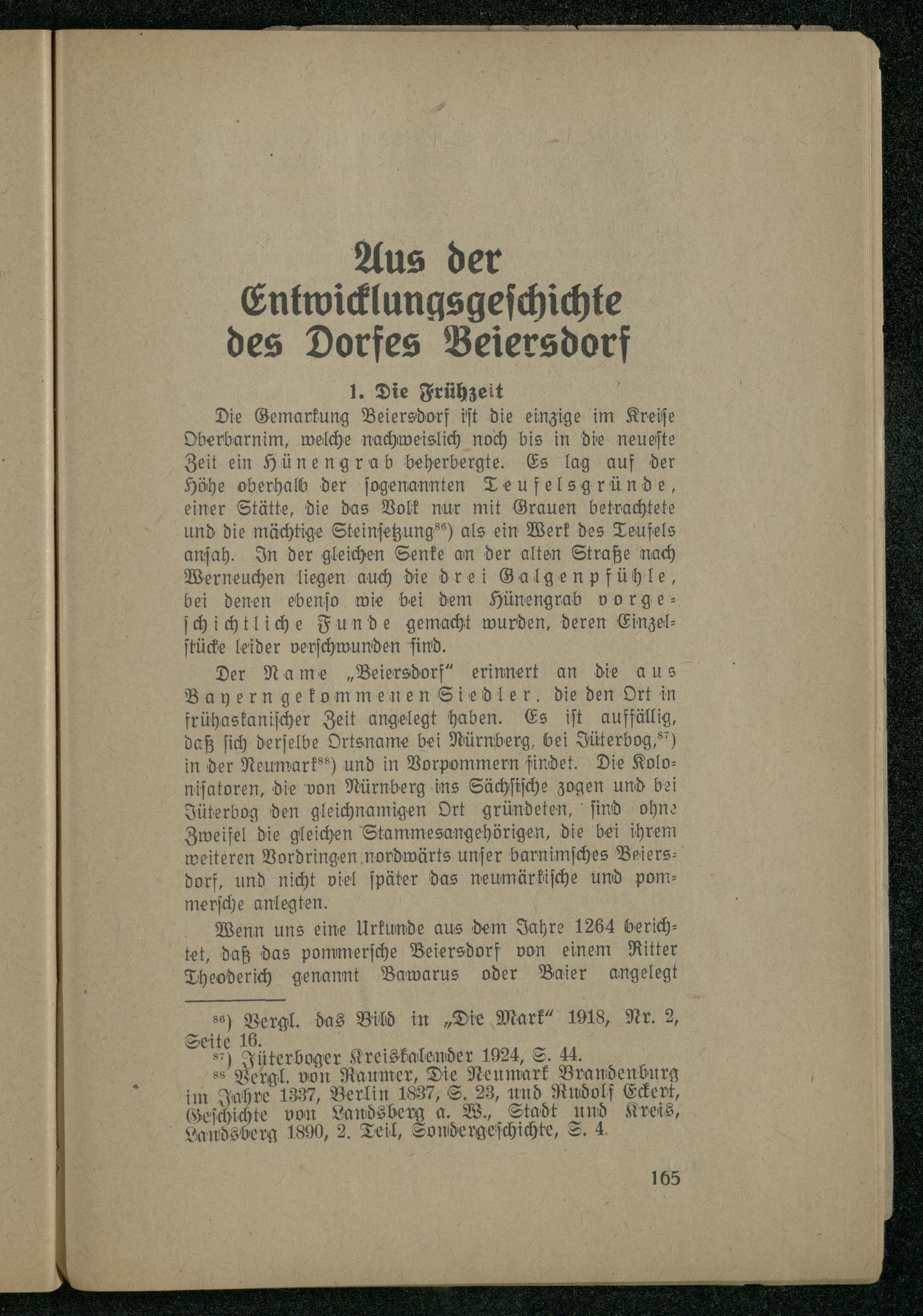 Der Name„Beiersdorf“ erinnert an die aus Bayern gekommenen Siedler die den Ort in frühaskaniſcher Zeit angelegt haben. Es iſt auffällig, daß ſich derſelbe Ortsname bei Nürnberg, bei Jüterbog,“) in der Neumarken) und in Vorpommern findet. Die Koloniſatoren, die von Nürnberg ins Sächſiſche zogen und bei Jüterbog den gleichnamigen Ort gründeten, ſind ohne Zweifel die gleichen Stammesangehörigen, die bei ihrem weiteren Vordringen nordwärts unſer barnimſches Beiers— dorf, und nicht viel ſpäter das neumärkiſche und pom— merſche anlegten.