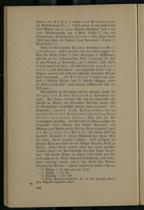 denen von Britzig 7, denen von Krummenfee (zu Altlandsberg) 534.—(1416 waren es nur noch 4 mit einer Abgabe von je„einer Mandel Groſchen“ und 1 mit einer Urbedezahlung von 5 Mark Silber,“) und der Strausberger Bürgerfamilie Duncker 1014 Hufen Land (1315 war ſchon ein Johann(aus) Beiersdorf„Conſul in Strausberg“). 1)