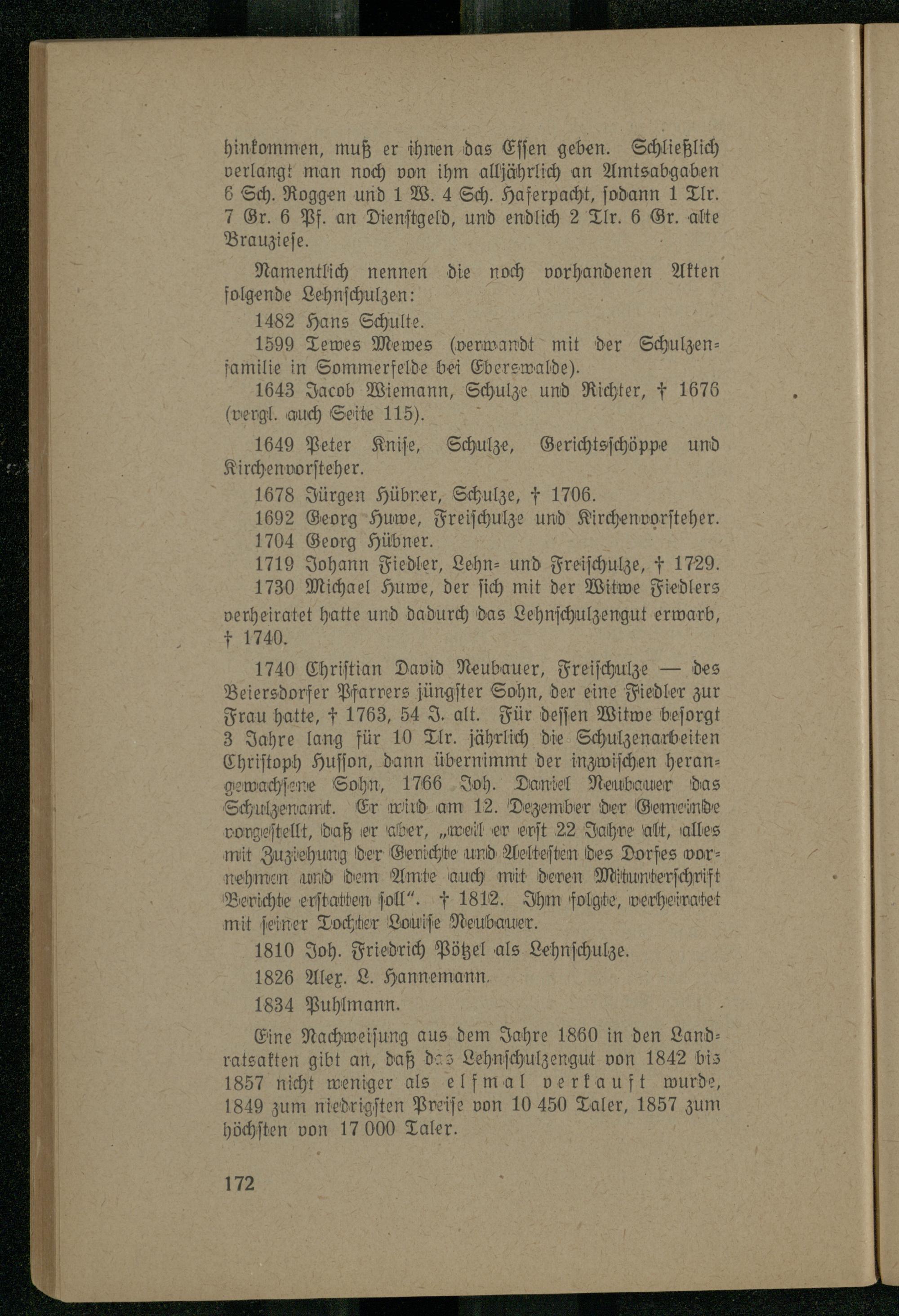 Eine Nachweiſung aus dem Jahre 1860 in den Landratsakten gibt an, daß das Lehnſchulzengut von 1842 bis 1857 nicht weniger als elfmal verkauft wurde, 1849 zum niedrigſten Preiſe von 10 450 Taler, 1857 zum höchſten von 17 000 Taler.
