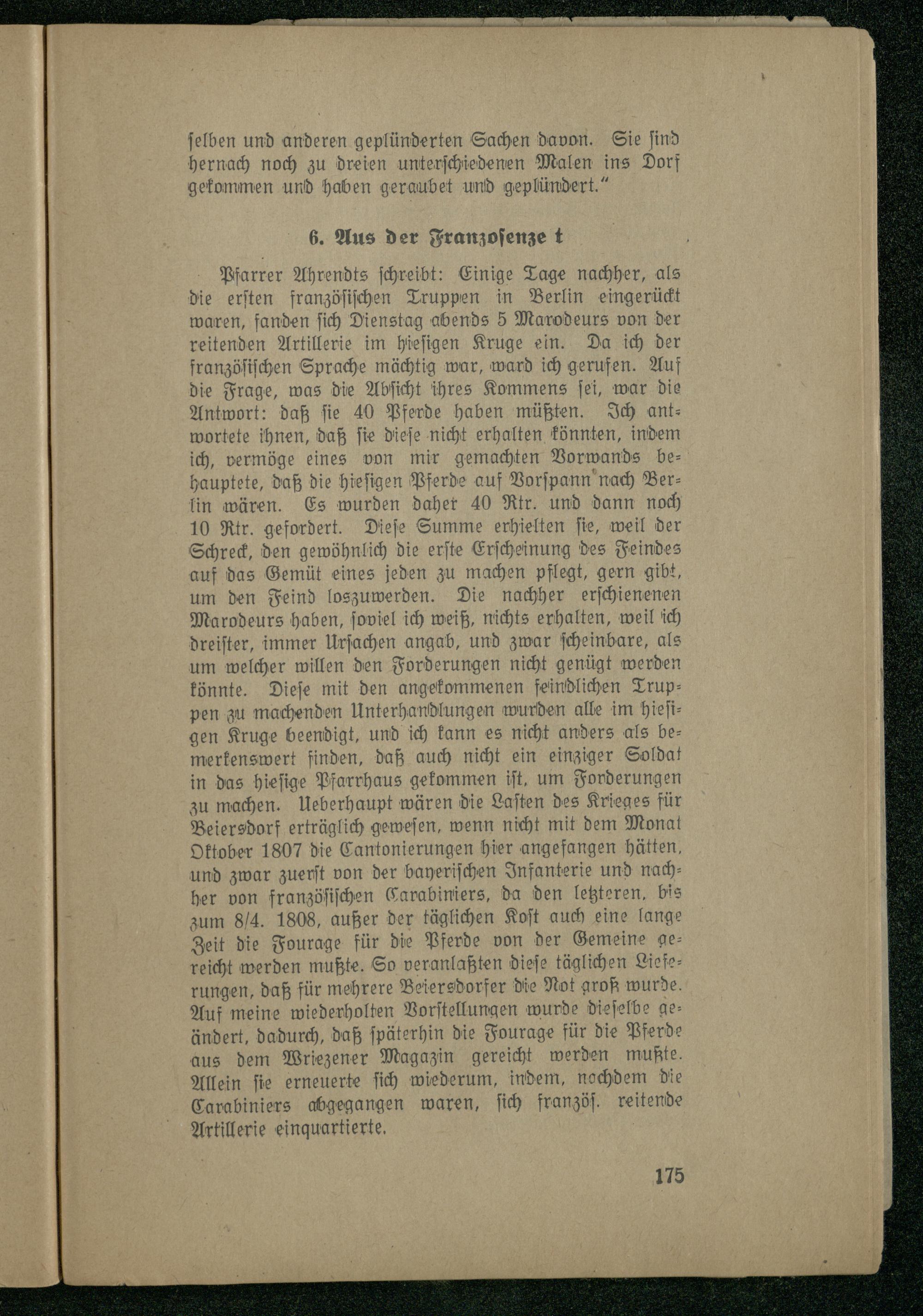 Pfarrer Ahrendts ſchreibt: Einige Tage nachher, als die erſten franzöſiſchen Truppen in Berlin eingerückt waren, fanden ſich Dienstag abends 5 Marxodeurs von der reitenden Artillerie im hieſigen Kruge ein. Da ich der franzöſiſchen Sprache mächtig war, ward ich gerufen. Auf die Frage, was die Abſicht ihres Kommens ſei, war die Antwort: daß ſie 40 Pferde haben müßten. Ich ant­wortete ihnen, daß ſie dieſe nicht erhalten könnten, indem ich, vermöge eines von mir gemachten Vorwands be­hauptete, daß die hieſigen Pferde auf Vorſpann nach Ber­lin wären. Es wurden daher 40 Rtr. und dann noch 10 Rtr. gefordert. Dieſe Summe erhielten ſie, weil der Schreck, den gewöhnlich die erſte Erſcheinung des Feindes auf das Gemüt eines jeden zu machen pflegt, gern gibt, um den Feind loszuwerden. Die nachher erſchienenen Marodeurs haben, ſoviel ich weiß, nichts erhalten, weil ich dreiſter, immer Urſachen angab, und zwar ſcheinbare, als um welcher willen den Forderungen nicht genügt werden könnte. Dieſe mit den angekommenen feindlichen Trup pen zu machenden Unterhandlungen wurden alle im hieſi­gen Kruge beendigt, und ich kann es nicht anders als be­merkenswert finden, daß auch nicht ein einziger Soldat in das hieſige Pfarrhaus gekommen iſt, um Forderungen zu machen. Ueberhaupt wären die Laſten des Krieges für Beiersdorf erträglich geweſen, wenn nicht mit dem Monat Oktober 1807 die Cantonierungen hier angefangen hätten, und zwar zuerſt von der bayeriſchen Infanterie und nach­her von franzöſiſchen Carabiniers, da den letzteren, bis zum 8/4. 1808, außer der täglichen Koſt auch eine lange Zeit die Fourage für die Pferde von der Gemeine ge­reicht werden mußte. So veranlaßten dieſe täglichen Liefe­rungen, daß für mehrere Beiersdorfer die Not groß wurde. Auf meine wiederholten Vorſtellungen wurde dieſelbe ge­ändert, dadurch, daß ſpäterhin die Fourage für die Pferde aus dem Wriezener Magazin gereicht werden mußte. Allein ſie erneuerte ſich wiederum, indem, nochdem die Carabiniers abgegangen waren, ſich franzöſ. reitende Artillerie einquartierte.