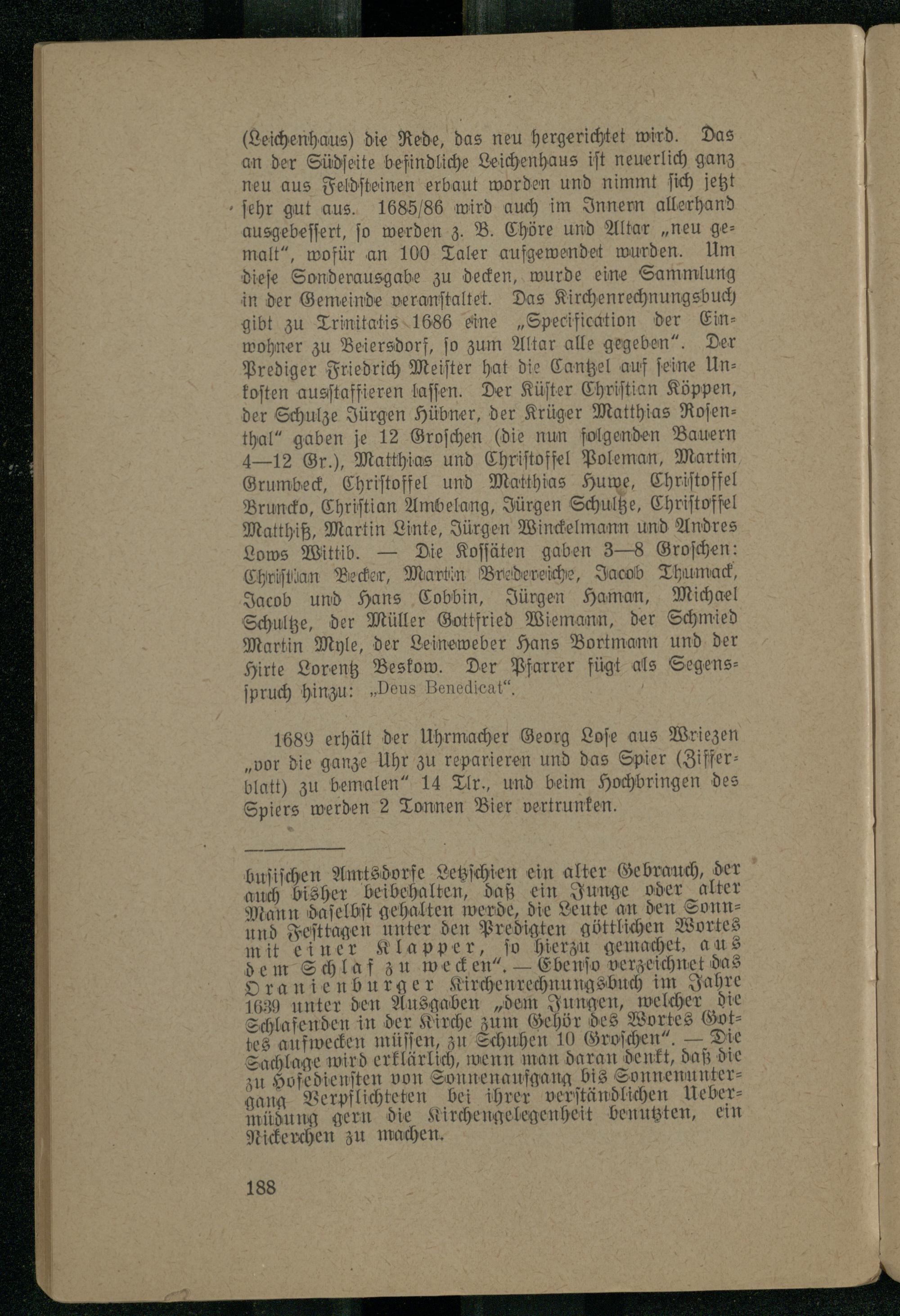 ausgebeſſert, ſo werden z. B. Chöre und Altar„neu gemalt“, wofür an 100 Taler aufgewendet wurden. Um dieſe Sonderausgabe zu decken, wurde eine Sammlung in der Gemeinde veranſtaltet. Das Kirchenrechnungsbuch gibt zu Trinitatis 1686 eine„Specification der Einwohner zu Beiersdorf, ſo zum Altar alle gegeben“. Der Prediger Friedrich Meiſter hat die Cantzel auf ſeine Unkoſten ausſtaffieren laſſen. Der Küſter Chriſtian Köppen, der Schulze Jürgen Hübner, der Krüger Matthias Roſenthal“ gaben je 12 Groſchen(die nun folgenden Bauern 4—12 Gr.), Matthias und Chriſtoffel Poleman, Martin Grumbeck, Chriſtoffel und Matthias Huwe, Chriſtoffel Bruncko, Chriſtian Ambelang, Jürgen Schultze, Chriſtoffel Matthiß, Martin Linte, Jürgen Winckelmann und Andres Lows Wittib.— Die Koſſäten gaben 3— Groſchen: Chriſtlan Becker, Martin Bredereiche, Jacob Thumack, Jacob und Hans Cobbin, Jürgen Haman, Michael Schultze, der Müller Gottfried Wiemann, der Schmied Martin Myle, der Leineweber Hans Bortmann und der Hirte Lorentz Beskow. Der Pfarrer fügt als Segens—ſpruch hinzu: Deus Benedicat“,
