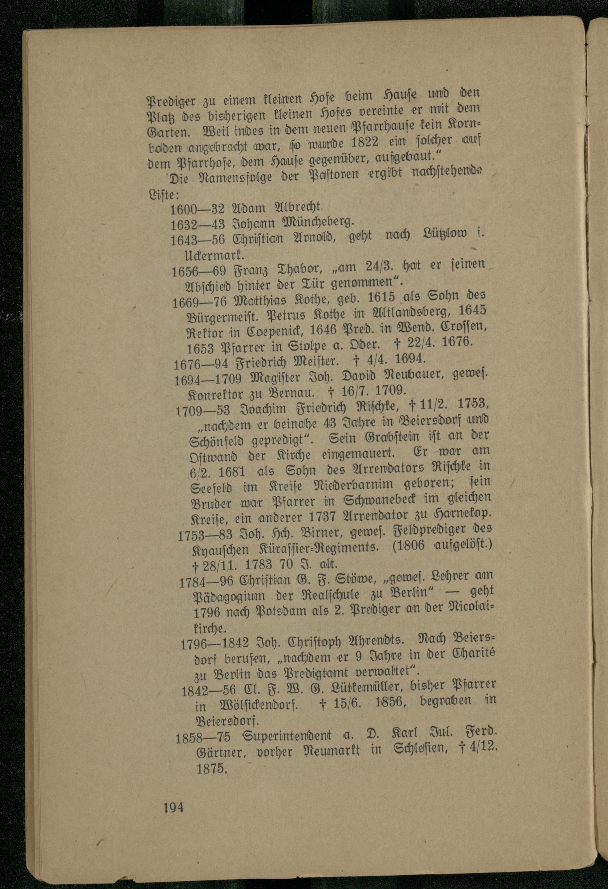 1795 1842 Joh. Chriſtoph Ahrendts. Nach Beiersdorf berufen,„nachdem er 9 Jahre in der Charite zu Berlin das Predigtamt verwaltet“.