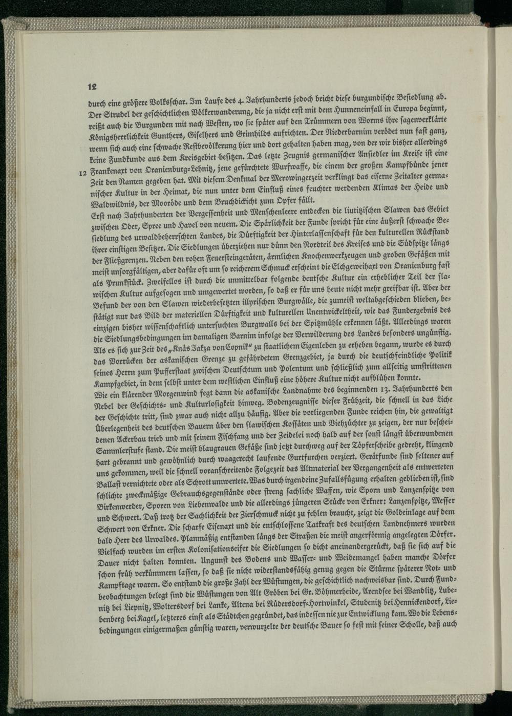 . Der Strudel der geſchichtlichen Völkerwanderung, die ja nicht erſt mit dem Hunnenein fall in Europa beginnt,. ö reißt auch die Burgunden mit nach Weſten, wo ſie ſpaͤter auf den Truͤmmern von Worms ihre ſagenverklaͤrte 7 Königsherrlichkeit Gunthers, Giſelhers und Grimhilds aufrichten. Der Niederbarnim veroddet nun faſt ganz, 4 J. wenn ſich auch eine ſchwache Reſtbev öͤlkerung hier und dort gehalten haben mag, von der wir bisher allerdings 5 Pi keine Fundkunde aus dem Kreisgebiet beſitzen. Das letzte Zeugnis germaniſcher Anſiedler im Kreiſe iſt eine
