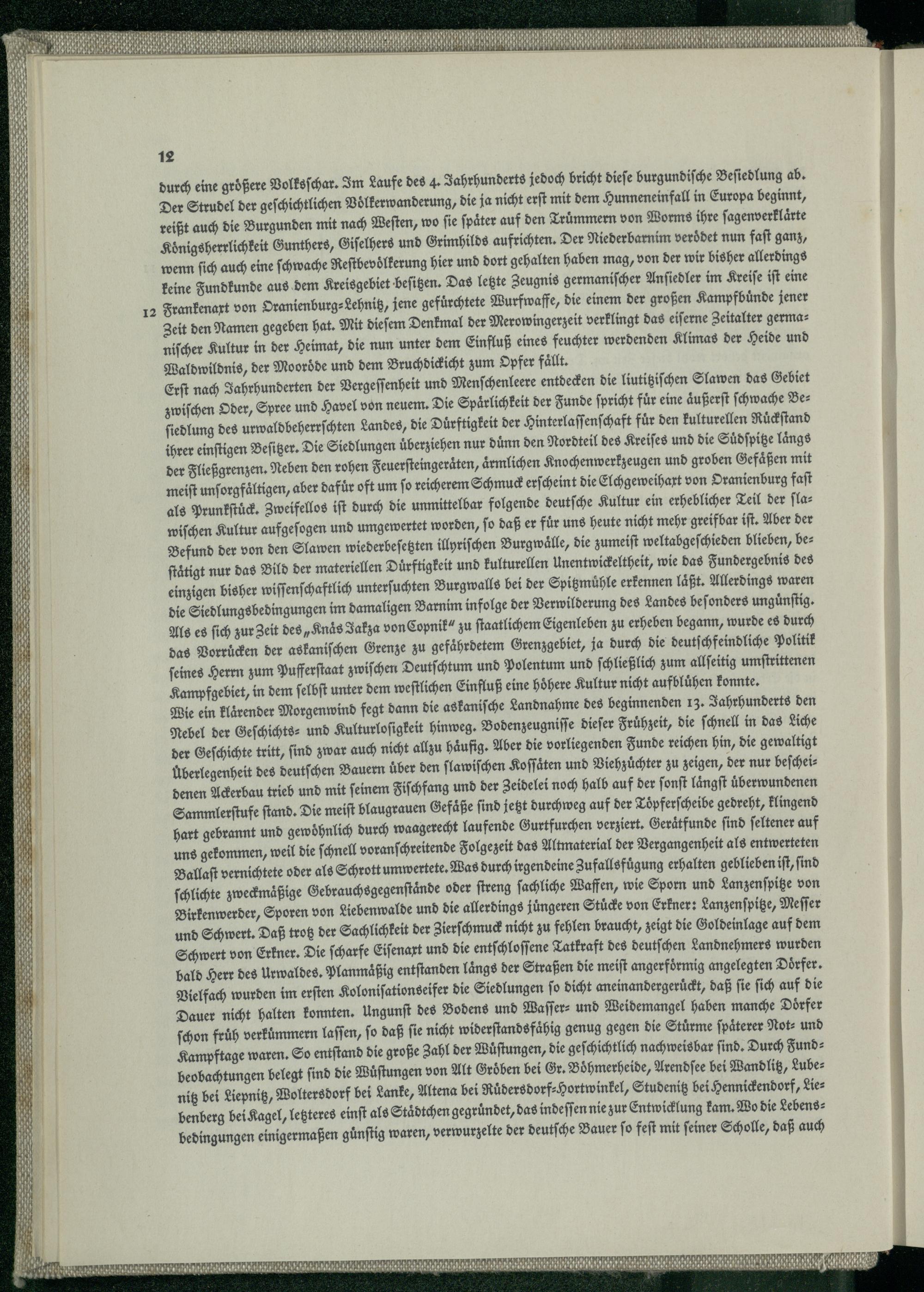 . ihrer einſtigen Beſitzer. Die Siedlungen überziehen nur dünn den Nordteil des Kreiſes und die Suͤdſpitze laͤngs . der Fließgrenzen. Neben den rohen Feuerſteingeraͤten, ärmlichen Knochenwerkzeugen und groben Gefaͤßen mit (hl meiſt unforgfältigen, aber dafür oft um fo reicherem Schmuck erſcheint die Elchgeweihaxt von Oranienburg faſt . als Prunkſtuͤck. Zweifellos iſt durch die unmittelbar folgende deutſche Kultur ein erheblicher Teil der ſla. wiſchen Kultur aufgeſogen und umgewertet worden, ſo daß er fuͤr uns heute nicht mehr greifbar iſt. Aber der ö. Befund der von den Slawen wiederbeſetzten illyriſchen Burgwaͤlle, die zumeiſt weltabgeſchieden blieben, be2 ſtaͤtigt nur das Bild der materiellen Duͤrftigkeit und kulturellen unentwickeltheit, wie das Fundergebnis des . einzigen bisher wiſſenſchaftlich unterſuchten Burgwalls bei der Spitzmuͤhle erkennen laͤßt. Allerdings waren . die Siedlungsbedingungen im damaligen Barnim infolge der Verwilderung des Landes beſonders unguͤnſtig.