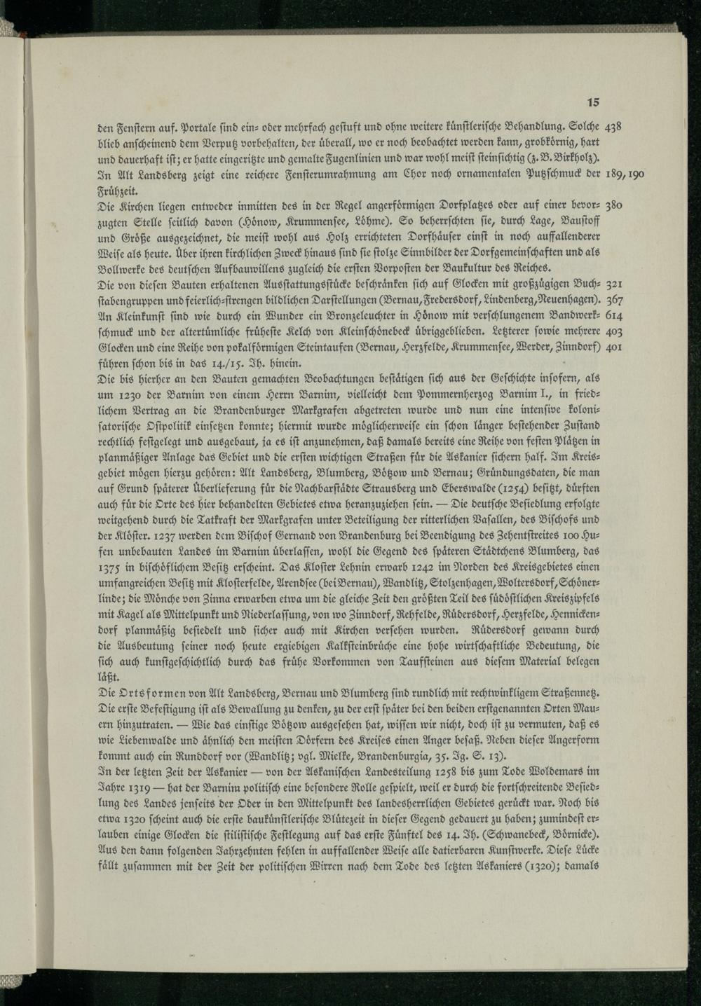 um 1230 der Barnim von einem Herrn Barnim , vielleicht dem Pommernherzog Barnim J., in friedlichem Vertrag an die Brandenburger Markgrafen abgetreten wurde und nun eine intenſive koloniſatoriſche Oſtpolitik einſetzen konnte; hiermit wurde moͤglicherweiſe ein ſchon laͤnger beſtehender Zuſtand rechtlich feſtgelegt und ausgebaut, ja es iſt anzunehmen, daß damals bereits eine Reihe von feſten lägen in planmaͤßiger Anlage das Gebiet und die erſten wichtigen Straßen für die Askanier ſichern half. Im Kreis: gebiet mögen hierzu gehören: Alt Landsberg, Blumberg , Boͤtzow und Bernau ; Gruͤndungs daten, die man