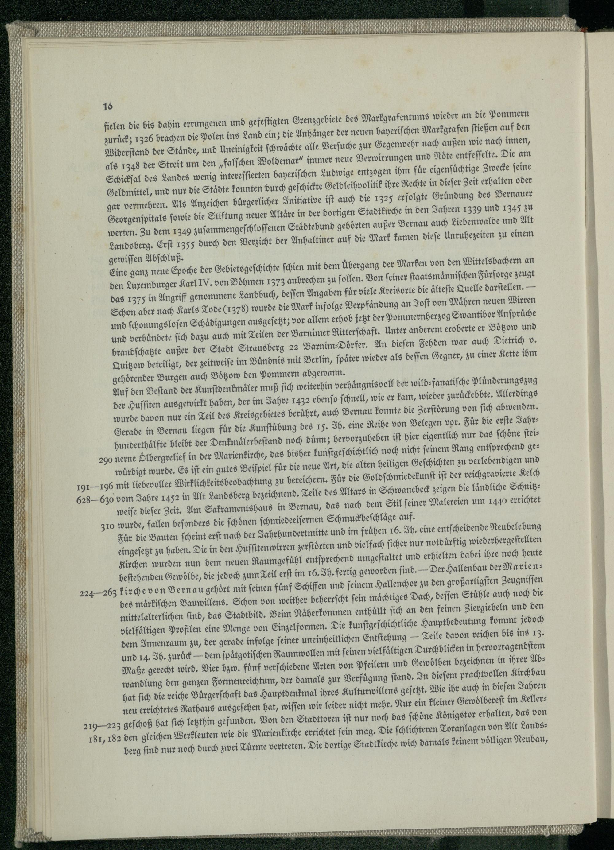 fielen die bis dahin errungenen und gefeſtigten Grenzgebiete des Markgrafentums wieder an die Pommern zuruck; 1326 brachen die Polen ins Land ein die Anhänger der neuen bayeriſchen Markgrafen ſtießen auf den Widerſtand der Stände, und uneinigkeit ſchwaͤchte alle Verſuche zur Gegenwehr nach außen wie nach innen, als 1348 der Streit um den falſchen Woldemar!/ immer neue Verwirrungen und Noͤte entfeſſelte. Die am Schickſal des Landes wenig intereſſierten bayeriſchen Ludwige entzogen ihm fuͤr eigenſuͤchtige Zwecke ſeine Geldmittel, und nur die Staͤdte konnten durch geſchickte Geldleihpolitik ihre Rechte in dieſer Zeit erhalten oder gar vermehren. Als Anzeichen bürgerlicher Initiative iſt auch die 1325 erfolgte Gruͤndung des Bernauer Georgenſpitals ſowie die Stiftung neuer Altaͤre in der dortigen Stadtkirche in den Jahren 1339 und 1345 zu werten. Zu dem 1349 zuſammengeſchloſſenen Staͤdtebund gehörten außer Bernau auch Liebenwalde und Alt Landsberg. Erſt 1355 durch den Verzicht der Anhaltiner auf die Mark kamen dieſe Unruhezeiten zu einem gewiſſen Abſchluß. Eine ganz neue Epoche der Gebietsgeſchichte ſchien mit dem Ubergang der Marken von den Wittelsbachern an den Luxemburger Karl IV. von Boͤhmen 1373 anbrechen zu ſollen. Von ſeiner ſtaatsmaͤnniſchen Fuͤrſorge zeugt das 1375 in Angriff genommene Landbuch, deſſen Angaben fuͤr viele Kreisorte die aͤlteſte Quelle darſtellen. Schon aber nach Karls Tode(1378) wurde die Mark infolge Verpfaͤndung an Joſt von Maͤhren neuen Wirren und ſchonungsloſen Schaͤdigungen ausgeſetzt; vor allem erhob jetzt der Po ßuueo Swantibor Anſpruͤche und verbuͤndete ſich dazu auch mit Teilen der Barnimer Ritterſchaft. Unter anderem eroberte er Boͤtzow und brandſchatzte außer der Stadt Strausberg 22 Barnim⸗Doͤrfer . An dieſen Fehden war auch Dietrich v. Quitzow beteiligt, der zeitweiſe im Bündnis mit Berlin , ſpaͤter wieder als deſſen Gegner, zu einer Kette ihm gehörender Burgen auch Boͤtzow den Pommern abgewann. Auf den Beſtand der Kunſtdenkmaͤler muß ſich weiterhin verhaͤngnisvoll der wild⸗fanatiſche Plunderungszug der Huſſiten ausgewirkt haben, der im Jahre 1432 ebenſo ſchnell, wie er kam, wieder zuruͤckebbte. Allerdings wurde davon nur ein Teil des Kreisgebietes beruͤhrt, auch Bernau konnte die Zerſtoͤrung von ſich abwenden. Gerade in Bernau liegen fuͤr die Kunſtuͤbung des 15. Ih. eine Reihe von Belegen vor. Fuͤr die erſte Jahr­hunderthaͤlfte bleibt der Denkmaͤlerbeſtand noch dünn; hervorzuheben iſt hier eigentlich nur das ſchöͤne ſtei­290 nerne OSlbergrelief in der Marienkirche, das bisher kunſtgeſchichtlich noch nicht ſeinem Rang entſprechend ge­wuͤrdigt wurde. Es iſt ein gutes Beiſpiel fuͤr die neue Art, die alten heiligen Geſchichten zu verlebendigen und