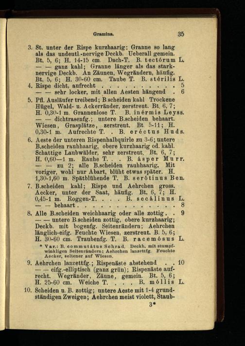 7. B.seheiden kahl; Rispe und Aehrchen gross. Aecker, unter der Saat, häufig. Bt. 6, 7; H. 0,45-1 m. Roggen-T. . . . B. secälinusL.