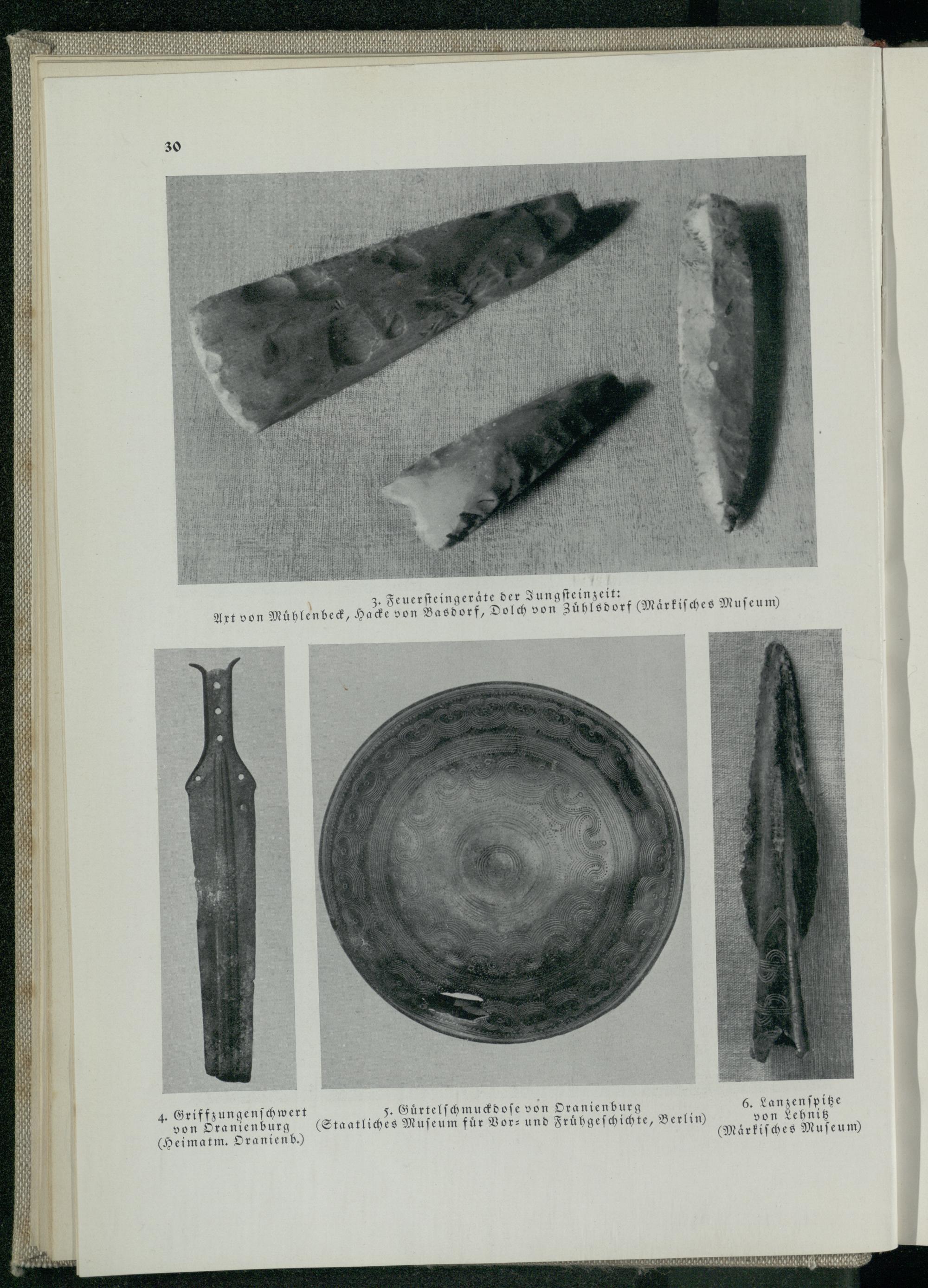 ö Feuerſteingeraͤte der Zungſteinzeit: Axt von Mühlenbeck , Hacke von Basdorf , Dolch von Zuhlsdorf Maͤrkiſches Muſeum) 6. Lanzenſpitze von Lehnitz (Maͤrkiſches Mu ſeum) ö K Guͤrtelſchmuckdoſe von Oranienburg (Staatliches Muſeum für Vor- und Fruͤhgeſchichte, Berlin ) 4. Griffzungenſchwert von Oranienburg (Heimatm. Oranienb.)