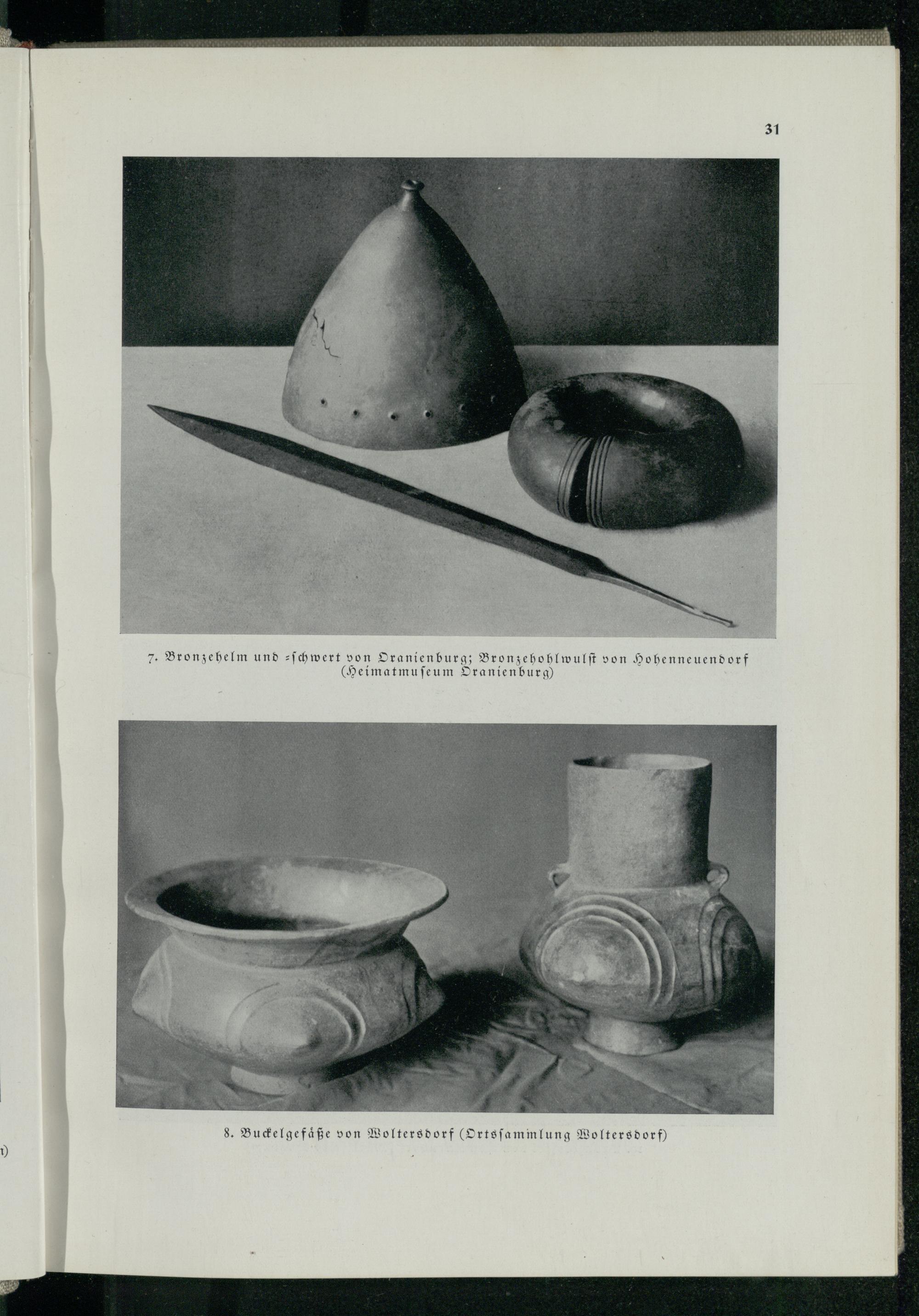 9 7. Bronzehelm und-ſchwert von Oranienburg ; Bronzehohlwulſt von Hohenneuendorf (Heimatmuſeum Oranienburg) 31 8. Buckelgefäße von Woltersdorf (Ortsſammlung Woltersdorf)