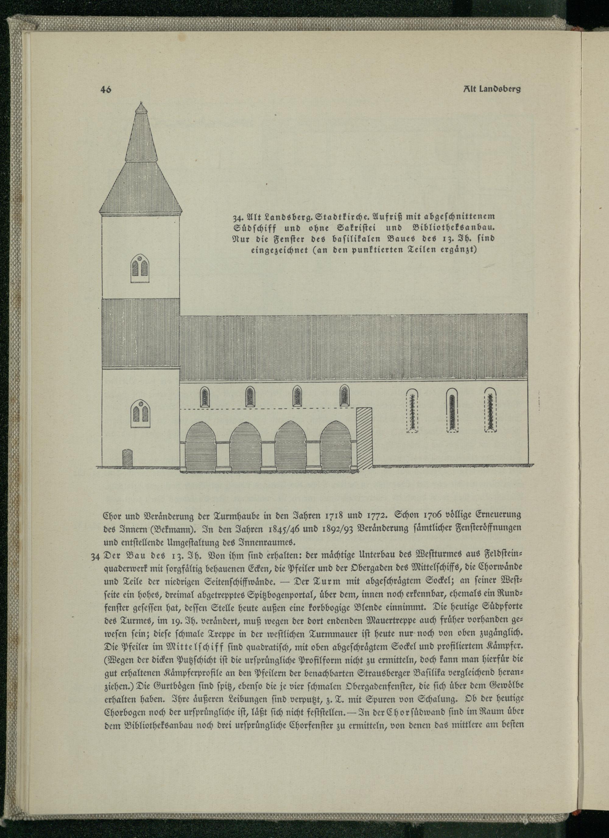 \ MH! ö 40 Alt Landsberg| AM| MM/ .| HE J 34. Alt Landsberg. Stadtkirche. Aufriß mit abgeſchnittenem . Suͤdſchiff und ohne Sakriſtei und Bibliotheksanbau. . Nur die Fenſter des baſilikalen Baues des 13. Ih. ſind . eingezeichnet(an den punktierten Teilen ergänzt) ö ö. . ö . [ ¶. MH n Chor und Veraͤnderung der Turmhaube in den Jahren 1718 und 1772. Schon 1706 völlige Erneuerung des Innern(Bekmann). In den Jahren 1845/46 und 1892/93 Veraͤnderung ſaͤmtlicher Fenſteröͤff nungen und entſtellende Umgeſtaltung des Innenraumes. 34 Der Bau des 13. Ih. Von ihm find erhalten: der mächtige Unterbau des Weſtturmes aus Feldſteinquaderwerk mit ſorgfaͤltig behauenen Ecken, die Pfeiler und der Obergaden des Mittelſchiffs, die Chorwaͤnde und Teile der niedrigen Seitenſchiffwaͤnde.— Der Turm mit abgeſchraͤgtem Sockel; an feiner Weſtſeite ein hohes, dreimal abgetrepptes Spitz bogenportal, über dem, innen noch erkennbar, ehemals ein Rundfenſter geſeſſen hat, deſſen Stelle heute außen eine korbbogige Blende einnimmt. Die heutige Suͤdpforte des Turmes, im 19. Ih. verändert, muß wegen der dort endenden Mauertreppe auch früher vorhanden geweſen fein; dieſe ſchmale Treppe in der weſtlichen Turmmauer iſt heute nur noch von oben zugänglich. Die Pfeiler im Mittelſchiff find quadratiſch, mit oben abgeſchraͤgtem Sockel und profiliertem Kämpfer. (Wegen der dicken Putzſchicht iſt die urſpruͤngliche Profilform nicht zu ermitteln, doch kann man hierfür die gut erhaltenen Kaͤmpferprofile an den Pfeilern der benachbarten Strausberger Baſilika vergleichend heranziehen.) Die Gurtboͤgen find ſpitz, ebenſo die je vier ſchmalen Obergadenfenſter, die ſich uͤber dem Gewölbe erhalten haben. Ihre aͤußeren Leibungen ſind verputzt, z. T. mit Spuren von Schalung. Ob der heutige 5 Chorbogen noch der urſpruͤngliche iſt, laͤßt ſich nicht feſtſtellen. In der Chor ſuͤdwand find im Raum über .| dem Bibliotheksanbau noch drei urſpruͤngliche Chorfenſter zu ermitteln, von denen das mittlere am beſten