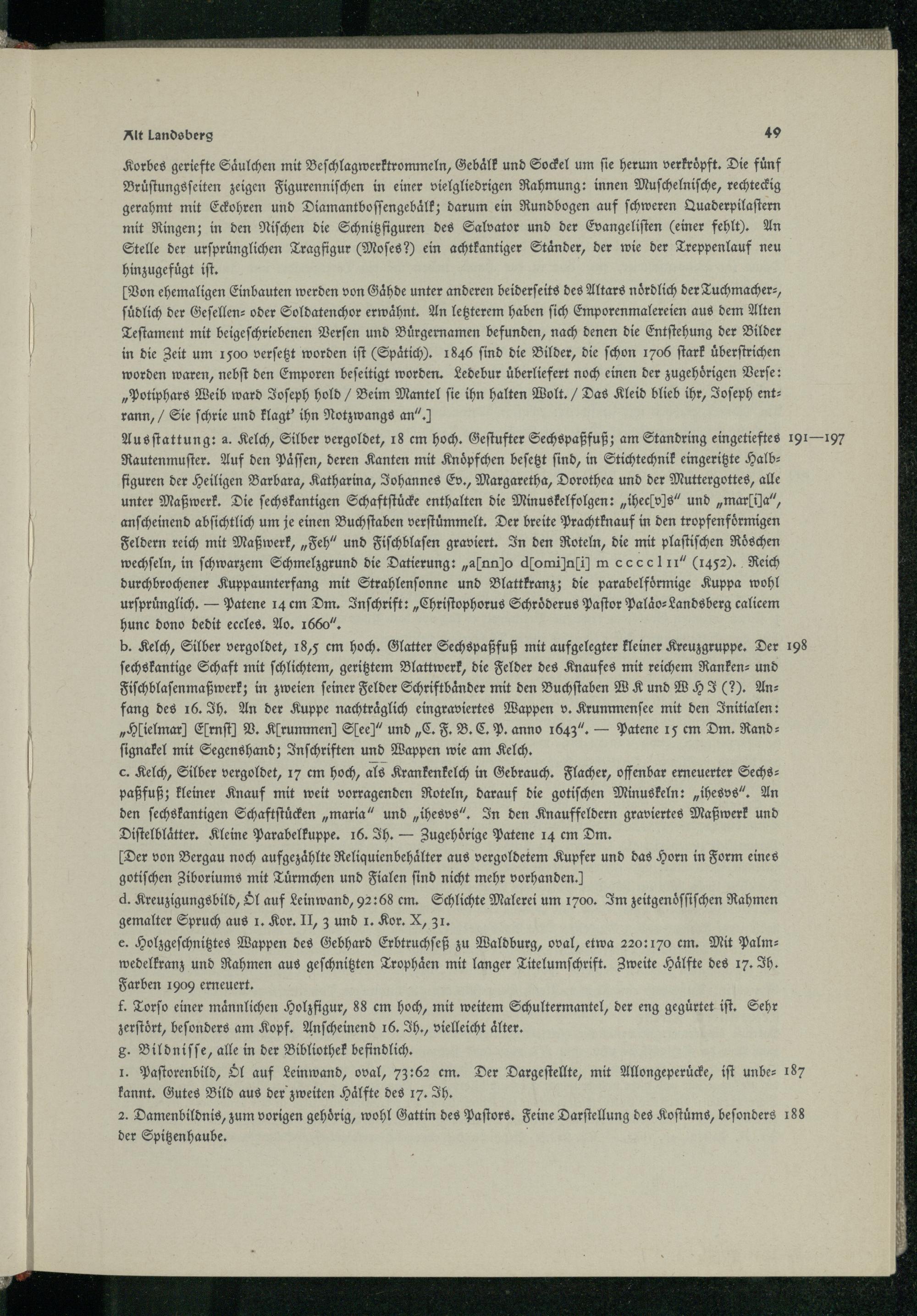 Austattung: a. Kelch, Silber vergoldet, 18 em hoch. Geſtufter Sechspaßfuß; am Standring eingetieftes 1916— 197 Rautenmuſter. Auf den Paͤſſen, deren Kanten mit Knoͤpfchen beſetzt ſind, in Stichtechnik eingeritzte Halbfiguren der Heiligen Barbara, Katharina, Johannes Ev., Margaretha, Dorothea und der Muttergottes, alle unter Maßwerk. Die ſechskantigen Schaftſtuͤcke enthalten die Minuskelfolgen:„iheclvſs“ und„maria“, anſcheinend abſichtlich um je einen Buchſtaben verſtuͤmmelt. Der breite Prachtknauf in den tropfenfoͤrmigen Feldern reich mit Maßwerk,„Feh“ und Fiſchblaſen graviert. In den Roteln, die mit plaſtiſchen Roͤschen wechſeln, in ſchwarzem Schmelzgrund die Datierung:„alnno dlominſi m ccccelı1"(1452). Reich durchbrochener Kuppaunterfang mit Strahlenſonne und Blattkranz; die parabelfoͤrmige Kuppa wohl urſpruͤnglich.— Patene 14 em Dm. Inſchrift:„Chriſtophorus Schroͤderus Paſtor Palaͤo⸗Landsberg calicem hunc dono dedit eccles. Ao. 1660“.