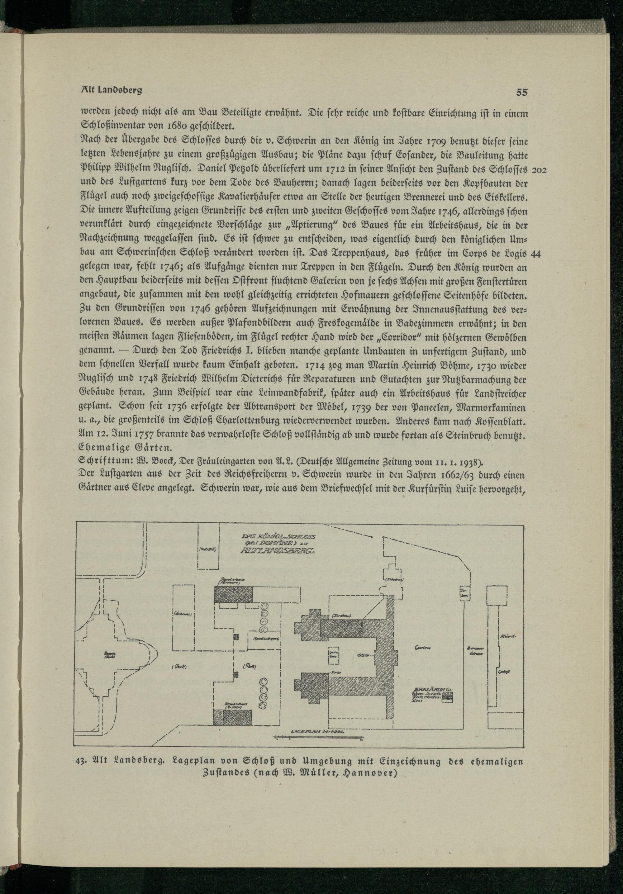 Nach der Übergabe des Schloſſes durch die v. Schwerin an den Koͤnig im Jahre 1709 benutzt dieſer ſeine | letzten Lebensjahre zu einem großzügigen Ausbau; die Pläne dazu ſchuf Eoſander , die Bauleitung hatte Philipp Wilhelm Nugliſch. Daniel Petzold uͤberliefert um 1712 in ſeiner Anſicht den Zuſtand des Schloſſes 202 und des Luſtgartens kurz vor dem Tode des Bauherrn ; danach lagen beiderſeits vor den Kopfbauten der J Fluͤgel auch noch zweigeſchoſſige Kavalierhaͤuſer etwa an Stelle der heutigen Brennerei und des Eiskellers. . Die innere Aufteilung zeigen Grundriſſe des erſten und zweiten Geſchoſſes vom Jahre 1746, allerdings ſchon verunklaͤrt durch eingezeichnete Vorſchlaͤge zur„Aptierung“ des Baues für ein Arbeitshaus, die in der Nachzeichnung weggelaſſen find. Es iſt ſchwer zu entſcheiden, was eigentlich durch den koͤniglichen Um: bau am Schwerinſchen Schloß veraͤndert worden iſt. Das Treppenhaus, das fruͤher im Corps de Logis 44 gelegen war, fehlt 1746; als Aufgaͤnge dienten nur Treppen in den Flügeln, Durch den König wurden an den Hauptbau beiderſeits mit deſſen Oſtfront fluchtend Galerien von je ſechs Achſen mit großen Fenſtertuͤren angebaut, die zuſammen mit den wohl gleichzeitig errichteten Hofmauern geſchloſſene Seitenhoͤfe bildeten. Zu den Grundriſſen von 1746 gehören Aufzeichnungen mit Erwaͤhnung der Innenausſtattung des verlorenen Baues. Es werden außer Plafondbildern auch Freskogemaͤlde in Badezimmern erwähnt; in den meiſten Räumen lagen Flieſenboͤden, im Fluͤgel rechter Hand wird der„Corridor“ mit hölzernen Gewoͤlben genannt.— Durch den Tod Friedrichs J. blieben manche geplante Umbauten in unfertigem Zuſtand, und dem ſchnellen Verfall wurde kaum Einhalt geboten. 1714 zog man Martin Heinrich Boͤhme , 1730 wieder Nugliſch und 1748 Friedrich Wilhelm Dieterichs für Reparaturen und Gutachten zur Nutzbarmachung der Gebaͤude heran. Zum Beiſpiel war eine Leinwandfabrik, ſpaͤter auch ein Arbeitshaus fuͤr Landſtreicher geplant. Schon ſeit 1736 erfolgte der Abtransport der Möbel, 1739 der von Paneelen, Marmorkaminen u. a., die großenteils im Schloß Charlottenburg wiederverwendet wurden. Anderes kam nach Koſſenblatt . Am 12. Juni 1757 brannte das verwahrloſte Schloß vollſtaͤmdig ab und wurde fortan als Steinbruch benutzt. Ehemalige Gaͤrten.