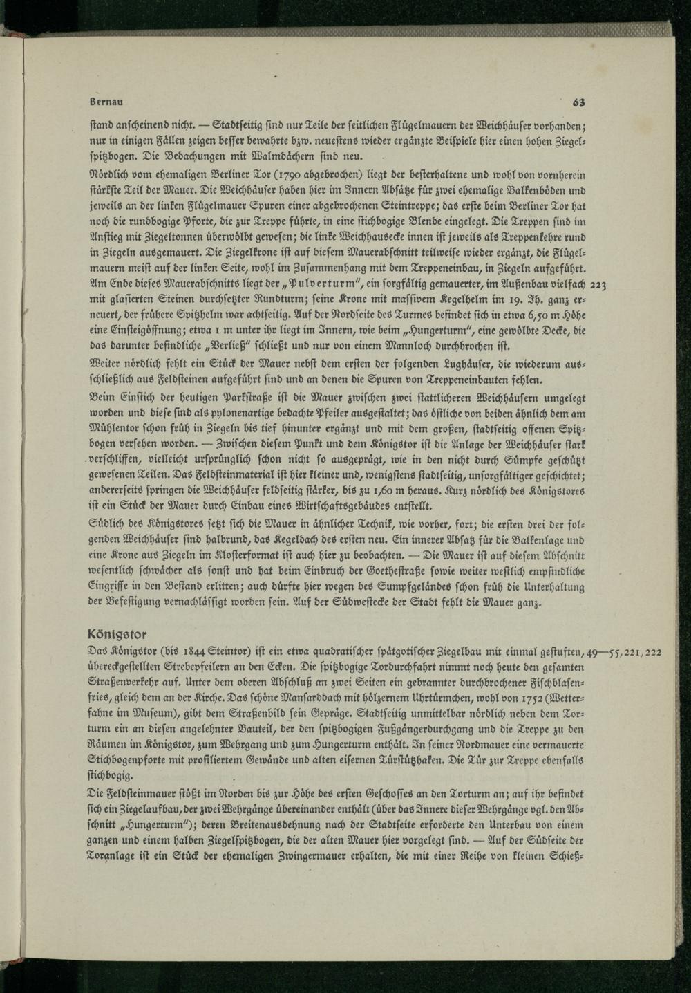 Das Koͤnigstor(bis 1844 Steintor) iſt ein etwa quadratiſcher ſpaͤtgotiſcher Ziegelbau mit einmal geſtuften, 44.— 55, 221, 222 uͤbereckgeſtellten Strebepfeilern an den Ecken. Die ſpitzbogige Tordurchfahrt nimmt noch heute den geſamten Straßenverkehr auf. Unter dem oberen Abſchluß an zwei Seiten ein gebrannter durchbrochener Fiſchblaſenfries, gleich dem an der Kirche. Das ſchoͤne Manſarddach mit hölzernem Uhrtuͤrmchen, wohl von 1752(Wetter: fahne im Muſeum), gibt dem Straßenbild fein Gepraͤge. Stadtſeitig unmittelbar nördlich neben dem Torturm ein an dieſen angelehnter Bauteil, der den ſpitzbogigen Fußgaͤngerdurchgang und die Treppe zu den Räumen im Koͤnigstor, zum Wehrgang und zum Hungerturm enthält. In feiner Nordmauer eine vermauerte Stichbogenpforte mit profiliertem Gewaͤnde und alten eiſernen Tuͤrſtuͤtz haken. Die Tuͤr zur Treppe ebenfalls ſtichbogig.;