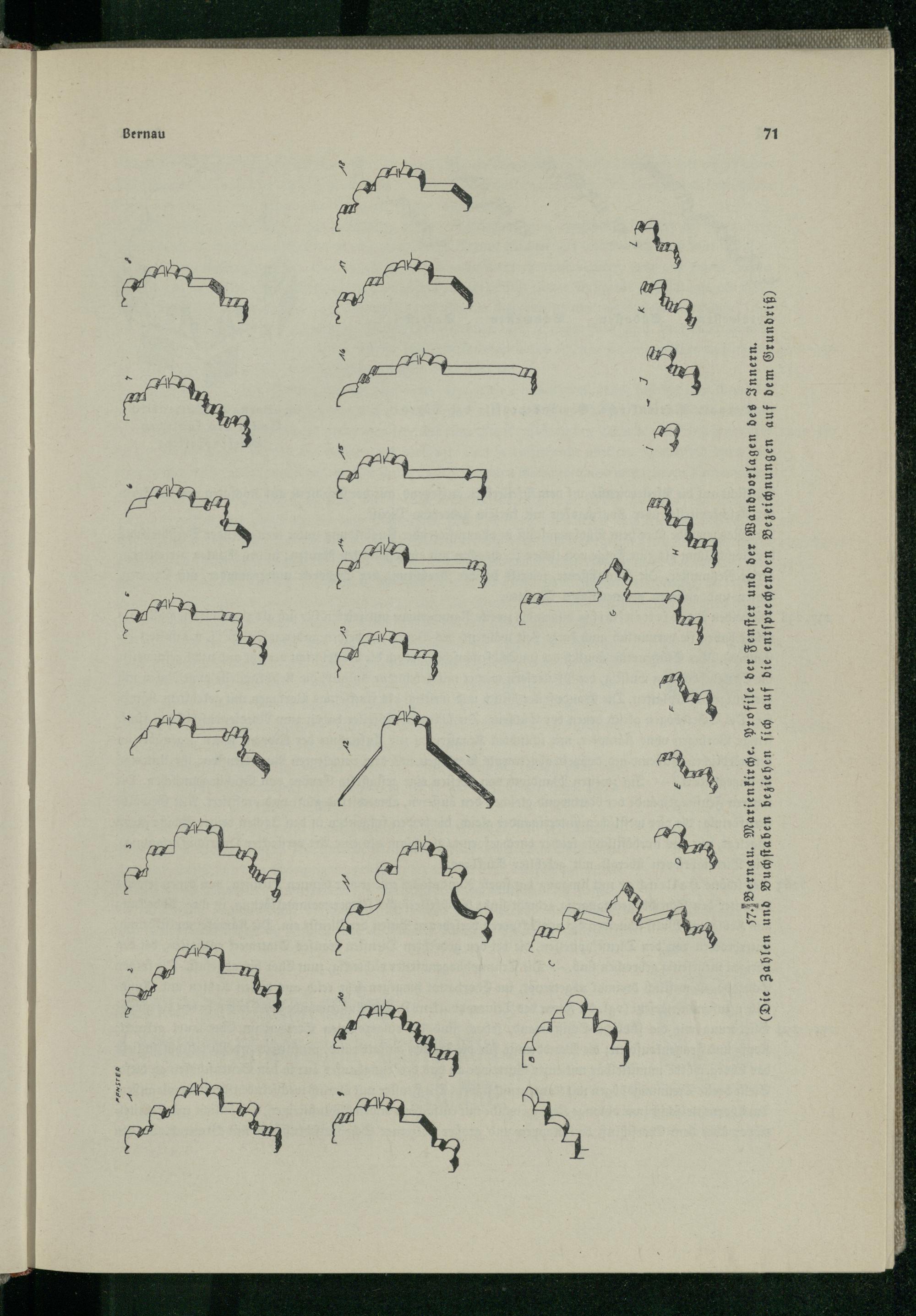 57. Bernau. Marienkirche. Profile der Fenſter und der Wandvorlagen des Innern. (Die Zahlen und Buchſtaben beziehen ſich auf die entſprechenden Bezeichnungen auf dem Grundriß)