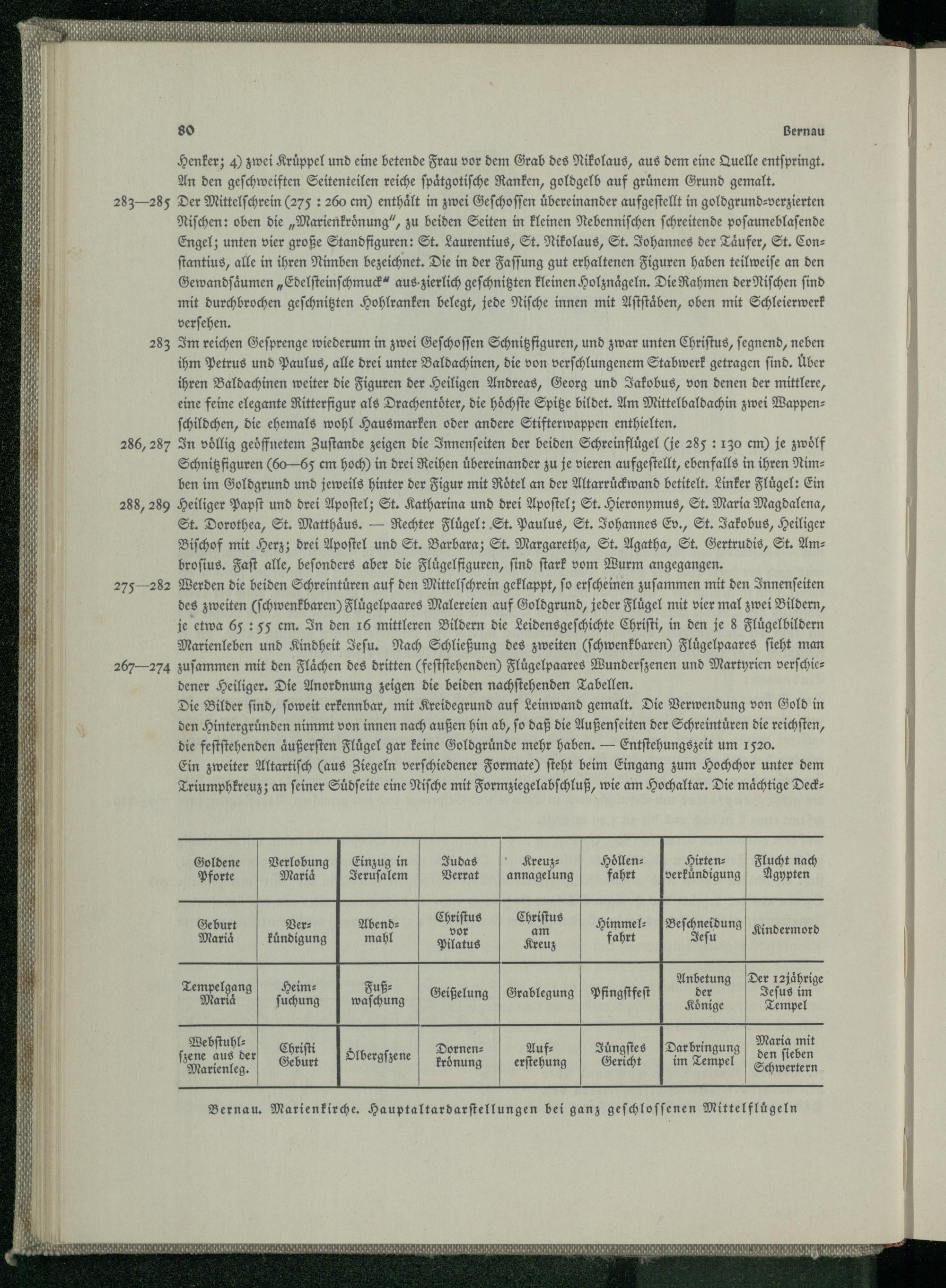 275— 282 Werden die beiden Schreintuͤren auf den Mittelſchrein geklappt, fo erſcheinen zuſammen mit den Innenſeiten des zweiten(ſchwenkbaren) Fluͤgelpaares Malereien auf Goldgrund, jeder Fluͤgel mit vier mal zwei Bildern, je etwa 65: 55 em. In den 16 mittleren Bildern die Leidensgeſchichte Chriſti , in den je 8 Fluͤgelbildern Marienleben und Kindheit Jeſu . Nach Schließung des zweiten(ſchwenkbaren) Fluͤgelpaares ſieht man