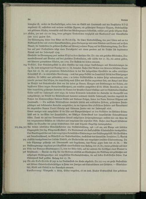 303 plaſtiſch durchgeformt das ſeitliche Tuͤrfeld, als Muſchelniſche mit vorgeſetzter joniſcher Saͤulenordnung. Die hohe Sitzwange geſchnitzt mit Loͤwenmaske und Engelherme, das Ganze gegen Ende des 16. Ih.— Als
