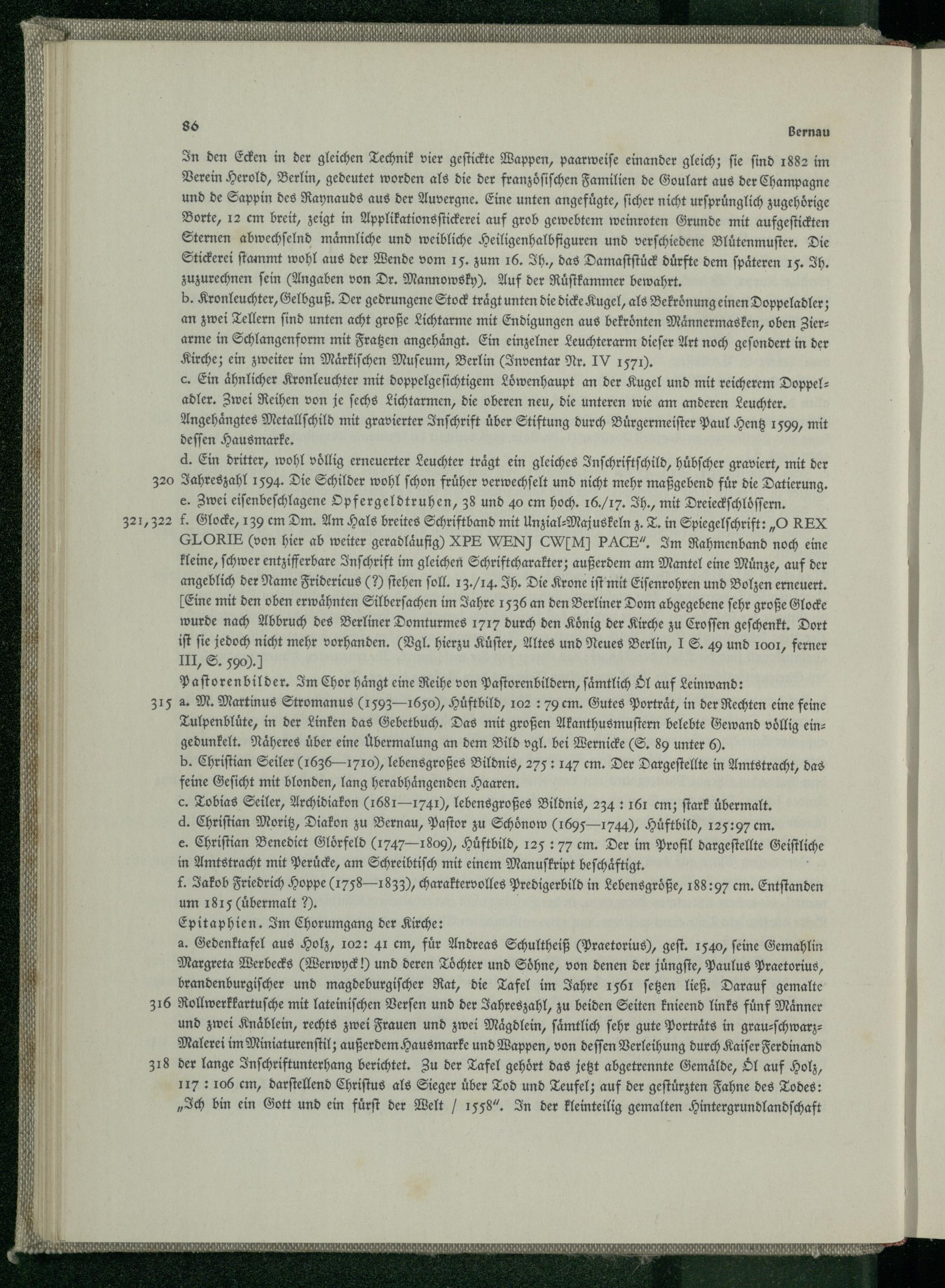 In den Ecken in der gleichen Technik vier geſtickte Wappen, paarweiſe einander gleich; ſie ſind 1882 im Verein Herold, Berlin , gedeutet worden als die der franzoͤſiſchen Familien de Goulart aus der Champagne und de Sappin des Raynauds aus der Auvergne. Eine unten angefuͤgte, ſicher nicht urſpruͤnglich zugehörige Borte, 12 em breit, zeigt in Applikationsſtickerei auf grob gewebtem weinroten Grunde mit aufgeſtickten Sternen abwechſelnd männliche und weibliche Heiligenhalbfiguren und verſchiedene Bluͤtenmuſter. Die Stickerei ſtammt wohl aus der Wende vom 15. zum 16. Ih., das Damaſtſtuͤck duͤrfte dem ſpaͤteren 15. Ih. zuzurechnen ſein(Angaben von Dr. Mannowsky). Auf der Ruͤſtkammer bewahrt. b. Kronleuchter, Gelbguß. Der gedrungene Stock trägt unten die dicke Kugel, als Bekroͤnung einen Doppeladler; an zwei Tellern find unten acht große Lichtarme mit Endigungen aus bekroͤnten Maͤnnermasken, oben Zierarme in Schlangenform mit Fratzen angehaͤngt. Ein einzelner Leuchterarm dieſer Art noch geſondert in der Kirche; ein zweiter im Maͤrkiſchen Muſeum, Berlin (Inventar Nr. IV 1571). c. Ein ähnlicher Kronleuchter mit doppelgeſichtigem Loͤwenhaupt an der Kugel und mit reicherem Doppeladler. Zwei Reihen von je ſechs Lichtarmen, die oberen neu, die unteren wie am anderen Leuchter. Angehaͤngtes Metallſchild mit gravierter Inſchrift über Stiftung durch Buͤrgermeiſter Paul Hentz 1599, mit deſſen Hausmarke. d. Ein dritter, wohl völlig erneuerter Leuchter trägt ein gleiches Inſchriftſchild, huͤbſcher graviert, mit der 320 Jahreszahl 1594. Die Schilder wohl ſchon fruͤher verwechſelt und nicht mehr maßgebend fuͤr die Datierung. e. Zwei eiſenbeſchlagene Opfergeldtruhen, 38 und 40 em hoch. 16.17. Ih., mit Dreieckſchloͤſſern. 321,322 f. Glocke, 139 em Dm. Am Hals breites Schriftband mit Unzial-Majuskeln z. T. in Spiegelſchrift: O REX GLORIE(von hier ab weiter geradlaͤufigs XPE WEN] CWC M] PACE“. Im Rahmenband noch eine kleine, ſchwer entzifferbare Inſchrift im gleichen Schriftcharakter; außerdem am Mantel eine Muͤnze, auf der u angeblich der Name Fridericus( ſtehen ſoll. 13./14. Ih. Die Krone iſt mit Eiſenrohren und Bolzen erneuert.. Eine mit den oben erwaͤhnten Silberſachen im Jahre 1536 an den Berliner Dom abgegebene ſehr große Glocke. wurde nach Abbruch des Berliner Domturmes 1717 durch den König der Kirche zu Croſſen geſchenkt. Dort iſt fie jedoch nicht mehr vorhanden.(Vgl. hierzu Kuͤſter, Altes und Neues Berlin , JS. 49 und 1001 ferner 4 HIT, S. 590).] Paſtorenbilder. Im Chor hängt eine Reihe von Paſtorenbildern, ſaͤmtlich Ol auf Leinwand: 315 a. M. Martinus Stromanus(1593-= 1650), Huͤftbild, 102: 79 em. Gutes Porträt, in der Rechten eine feine Tulpenbluͤte, in der Linken das Gebetbuch. Das mit großen Akanthusmuſtern belebte Gewand völlig ein: gedunkelt. Näheres über eine Ubermalung an dem Bild vgl. bei Wernicke(S. 89 unter 6). b. Chriſtian Seiler(1636- 710), lebensgroßes Bildnis, 275: 147 em. Der Dargeſtellte in Amtstracht, das feine Geſicht mit blonden, lang herabhaͤngenden Haaren. c. Tobias Seiler , Archidiakon(1681- 1741, lebensgroßes Bildnis, 234: 161 em; ſtark uͤbermalt. d. Chriſtian Moritz, Diakon zu Bernau , Paſtor zu Schoͤnow (1695 – 744, Huͤftbild, 125: 9 em. e. Chriſtian Benedict Gloͤrfeld(1747— 1809), Huͤftbild, 125: 77 em. Der im Profil dargeſtellte Geiſtliche in Amtstracht mit Peruͤcke, am Schreibtiſch mit einem Manuſkript beſchaͤftigt. f. Jakob Friedrich Hoppe(1758- 1833), charaktervolles Predigerbild in Lebensgroͤße, 188: 9 em. Entſtanden um 181(u bermalt?). Epitaphien. Im Chorumgang der Kirche: a. Gedenktafel aus Holz, 102: 41 em, fuͤr Andreas Schultheiß(Praetorius), geſt. 1540, ſeine Gemahlin Margreta Werbecks(Werwyck) und deren Töchter und Söhne, von denen der juͤngſte, Paulus Praetorius , brandenburgiſcher und magdeburgiſcher Rat, die Tafel im Jahre 1561 ſetzen ließ. Darauf gemalte 316 Rollwerkkartuſche mit lateiniſchen Verſen und der Jahreszahl, zu beiden Seiten knieend links fünf Männer und zwei Knaͤblein, rechts zwei Frauen und zwei Maͤgdlein, ſaͤmtlich ſehr gute Portraͤts in grau⸗ſchwarzMalerei im Miniaturenſtil; außerdem Hausmarke und Wappen, von deſſen Verleihung durch Kaiſer Ferdinand 318 der lange Inſchriftunterhang berichtet. Zu der Tafel gehört das jetzt abgetrennte Gemälde, Ol auf Holz ö. 117: 106 em, darſtellend Chriſtus als Sieger über Tod und Teufel; auf der geſtuͤrzten Fahne des Todes: „Ich bin ein Gott und ein fuͤrſt der Welt/ 1558. In der kleinteilig gemalten Hintergrundlandſchaft