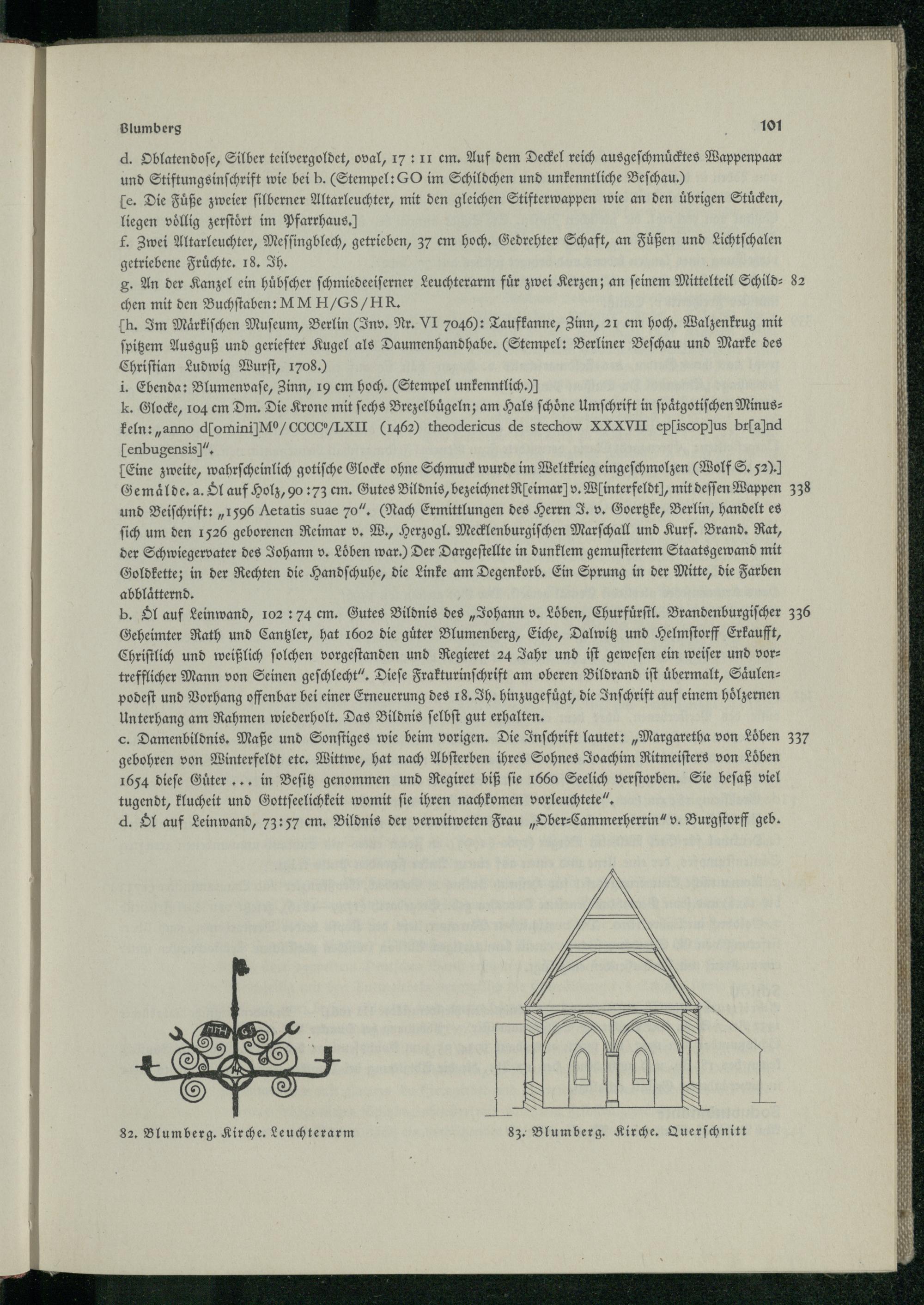 c. Damenbildnis. Maße und Sonstiges wie beim vorigen. Die Inschrift lautet:„ Margaretha von Löben 337 gebohren von Winterfeldt etc. Wittwe, hat nach Absterben ihres Sohnes Joachim Ritmeisters von Löben 1654 diese Güter... in Besiz genommen und Regiret biß sie 1660 Seelich verstorben. Sie besaß viel tugendt, klucheit und Gottseelichkeit womit sie ihren nachkomen vorleuchtete".