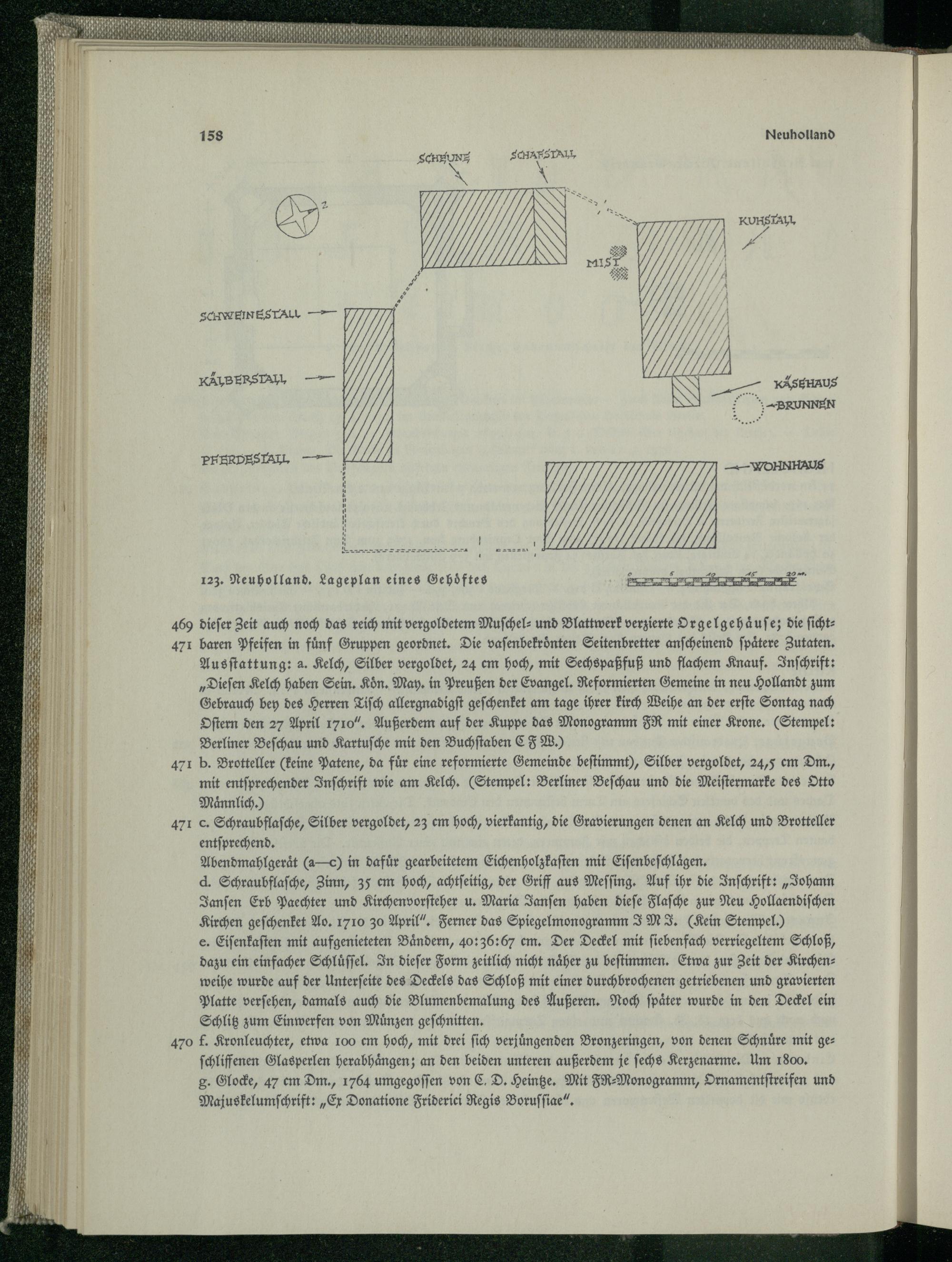 471 baren Pfeifen in fünf Gruppen geordnet. Die vaſenbekroͤnten Seitenbretter anſcheinend ſpaͤtere Zutaten. Ausſtattung: a. Kelch, Silber vergoldet, 24 em hoch, mit Sechspaßfuß und flachem Knauf. Inſchrift: „Dieſen Kelch haben Sein. Kon. May. in Preußen der Evangel. Reformierten Gemeine in neu Hollandt zum Gebrauch bey des Herren Tiſch allergnadigſt geſchenket am tage ihrer kirch Weihe an der erſte Sontag nach Oſtern den 27 April 1710“. Außerdem auf der Kuppe das Monogramm FIR mit einer Krone.(Stempel: Berliner Beſchau und Kartuſche mit den Buchſtaben CF W.)