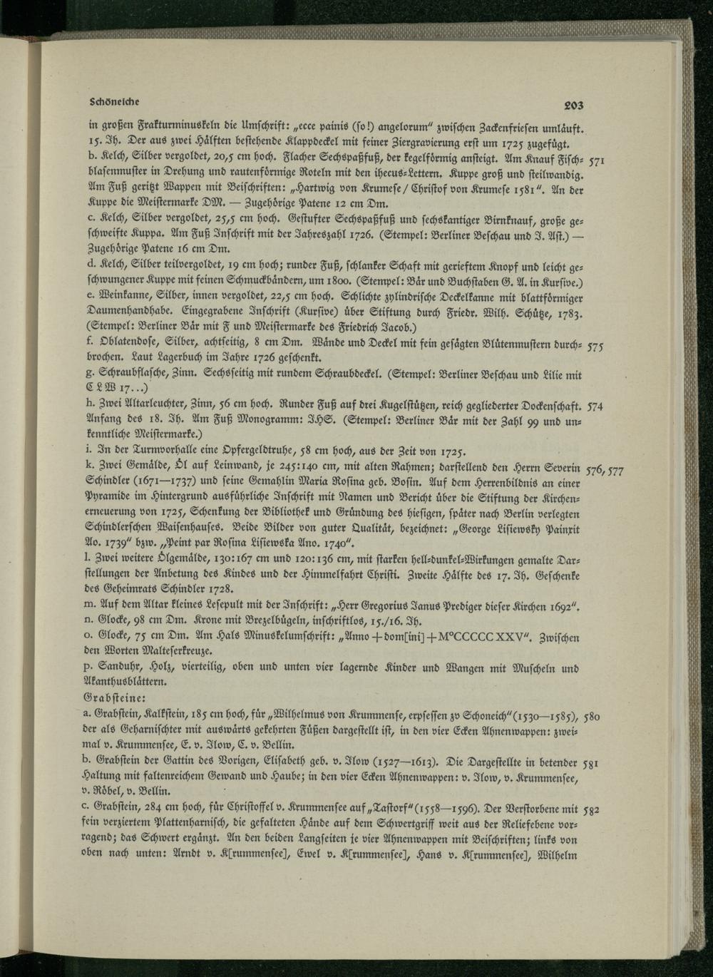 a. Grabſtein, Kalkſtein, 185 em hoch, fuͤr, Wilhelmus von Krummenſe, erpſeſſen zu Schoneich“(1530 – 1585), 580 der als Geharniſchter mit auswärts gekehrten Füßen dargeftellt iſt, in den vier Ecken Ahnen wappen: zweimal v. Krummenſee, E. v. Ilow, C. v. Bellin.