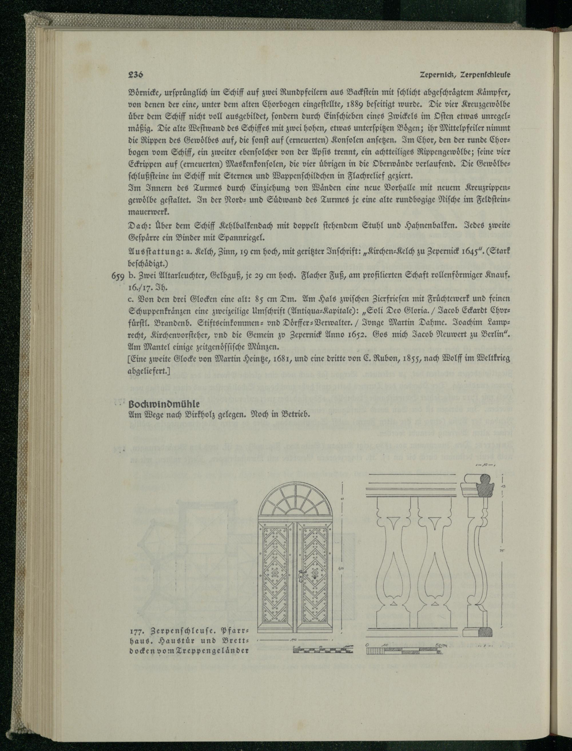 Ausſtattung: a. Kelch, Zinn, 19 em hoch, mit geritzter Inſchrift:„Kirchen⸗-Kelch zu Zepernick 1645”, Stark beſchaͤdigt.)