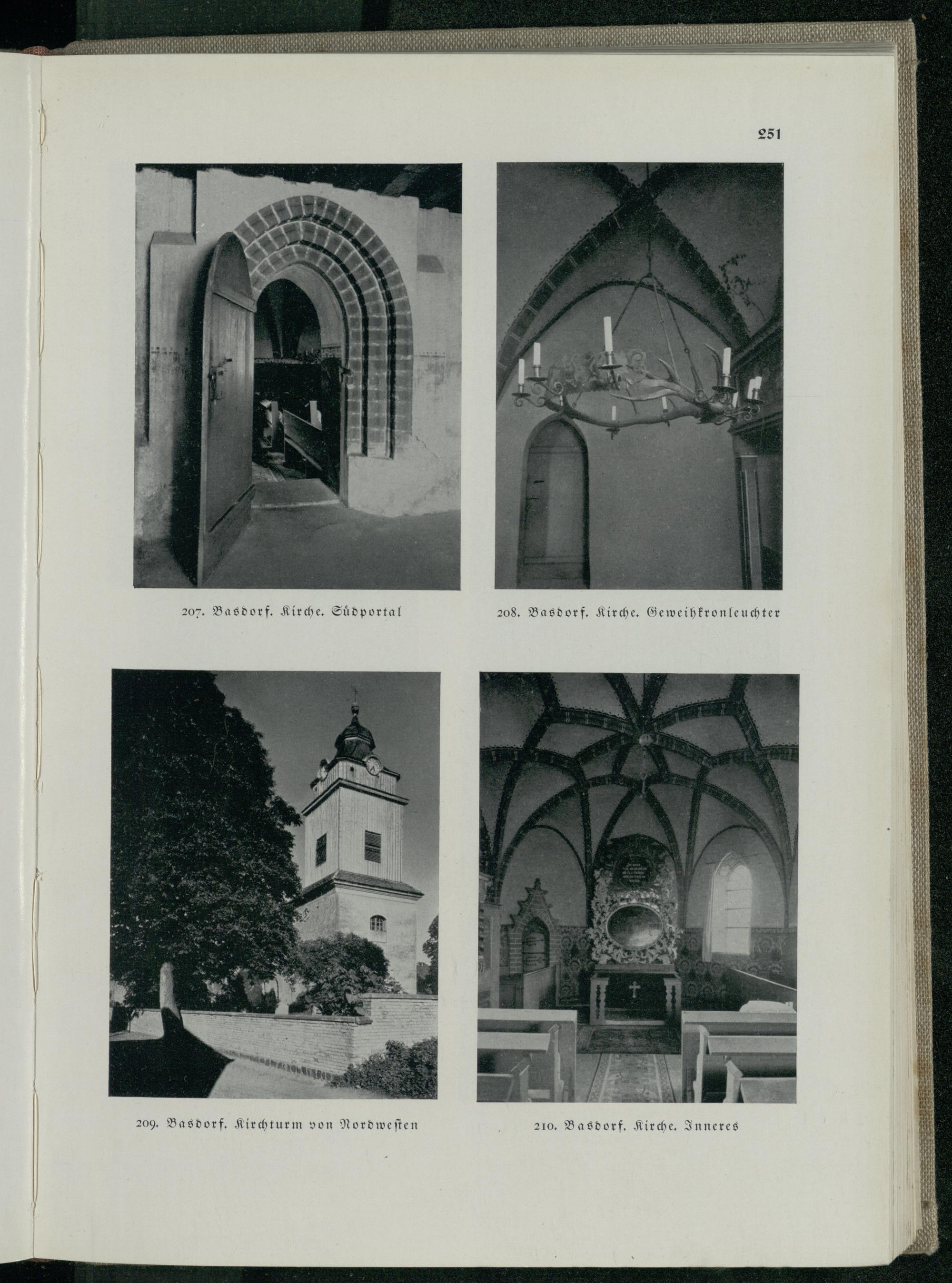 251 207. Basdorf . Kirche. Südportal 208. Basdorf. Kirche. Geweih kronleuchter t 209. Basdorf. Kirchturm von Nordwesten 210. Basdorf. Kirche. Inneres