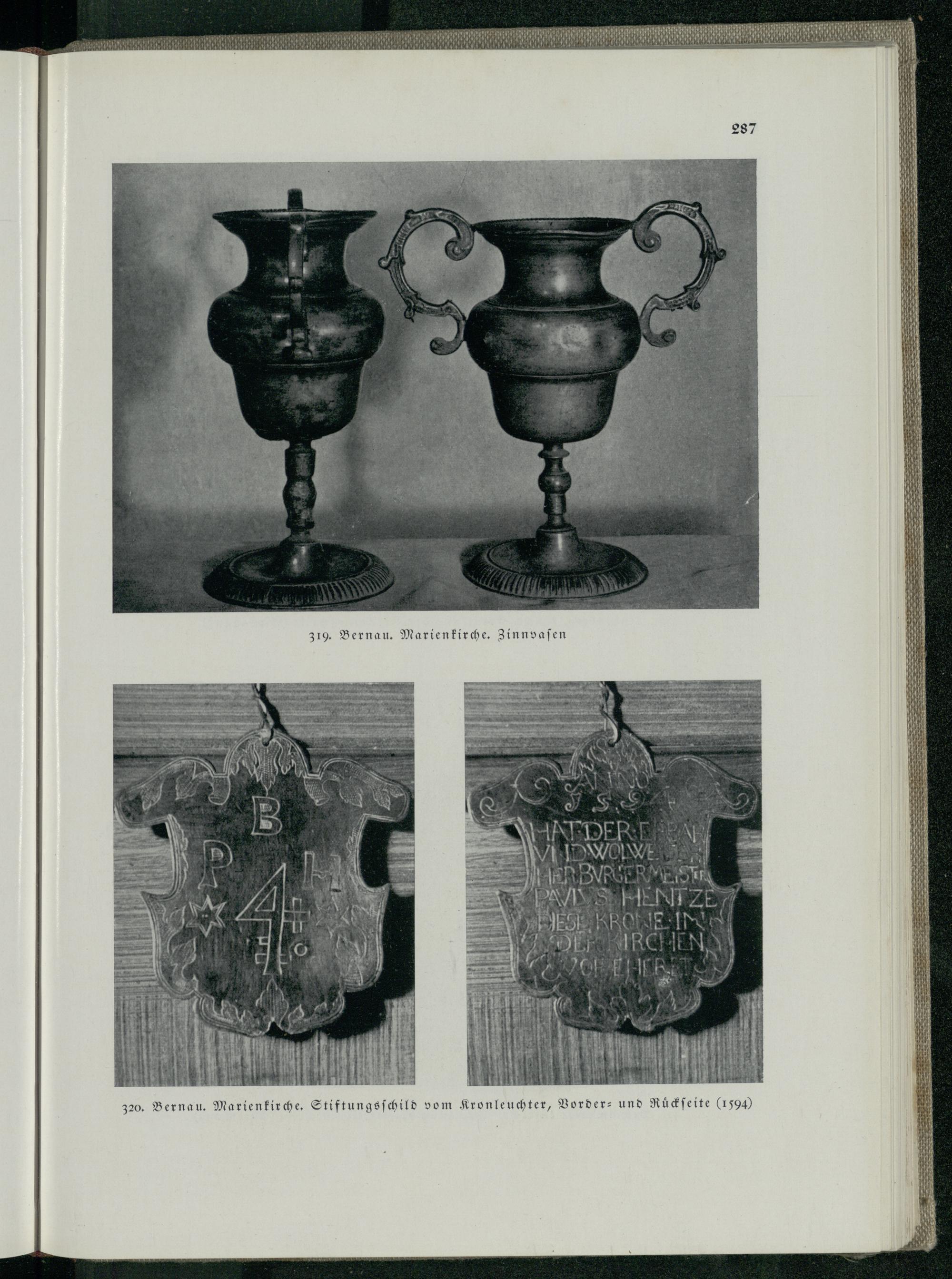 319. Bernau . Marienkirche. Zinnvasen B O AN HATDER EPPAR VIDWOLWE CON HERBVRGERMEISTR PAVINS HENTZE JEST KRONE IN DLP KIRCHEN OF THERET 320. Bernau. Marienkirche. Stiftungsschild vom Kronleuchter, Vorder- und Rückseite( 1594) 287