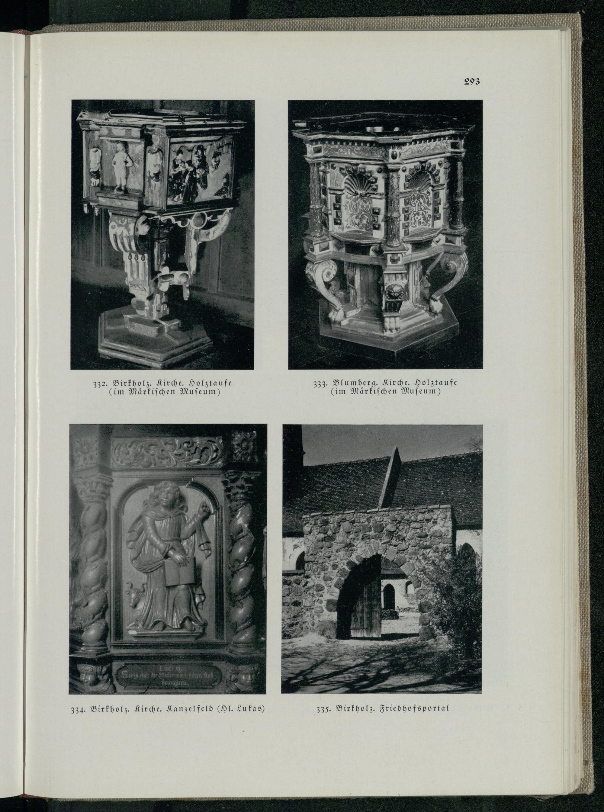 332. Birkholz. Kirche. Holztaufe ( im Märkischen Museum) 333. Blumberg . Kirche. Holztaufe ( im Märkischen Museum) Sajo jud die Sedistort fören und tamagren. 334. Birkholz. Kirche. Kanzelfeld( Hl. Lukas) 335. Birkholz. Friedhofsportal 293