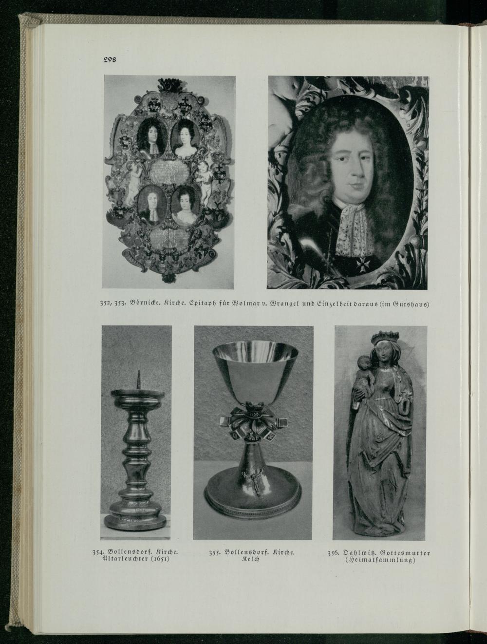 298 352, 353. Börnicke. Kirche. Epitaph für Wolmar v. Wrangel und Einzelheit daraus( im Gutshaus) 354. Bollensdorf. Kirche. 355. Bollensdorf. Kirche. 356. Dahlwiß. Gottesmutter Altarleuchter( 1651) Kelch ( Heimatsammlung)