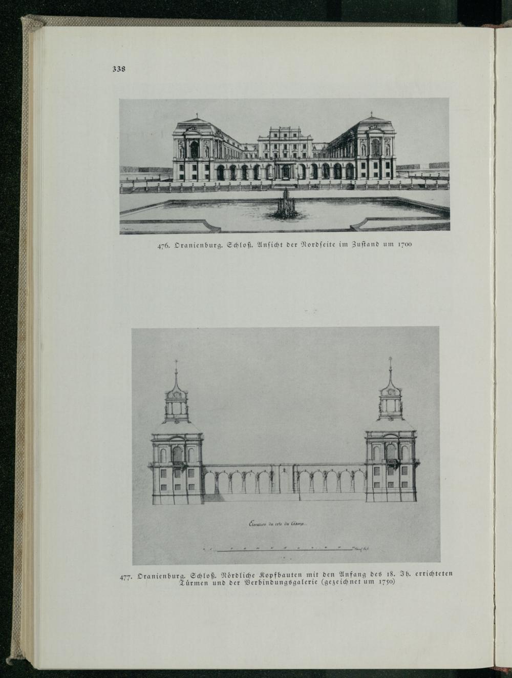 338 476. Oranienburg . Schloß. Ansicht der Nordseite im Zustand um 1700 Elevation du cote du Champ... Where Sup 477. Oranienburg. Schloß. Nördliche Kopfbauten mit den Anfang des 18. Ih. errichteten Túrmen und der Verbindungsgalerie( gezeichnet um 1750)
