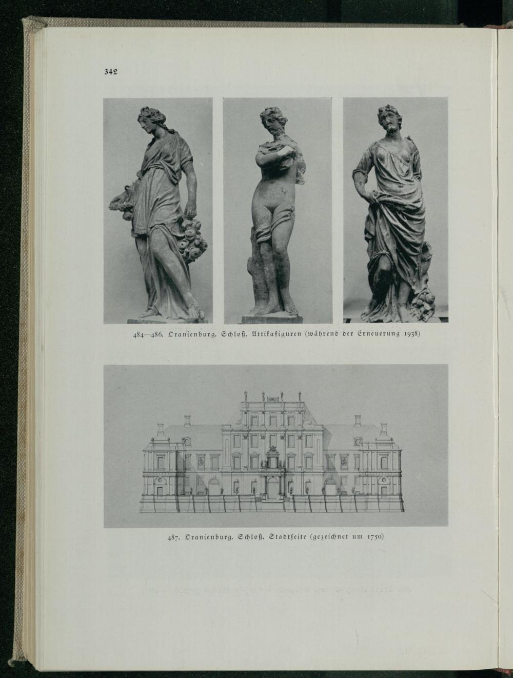 342 484-486. Oranienburg . Schloß. Attika figuren( während der Erneuerung 1938) 487. Oranienburg . Schloß. Stadtseite( gezeichnet um 1750) H