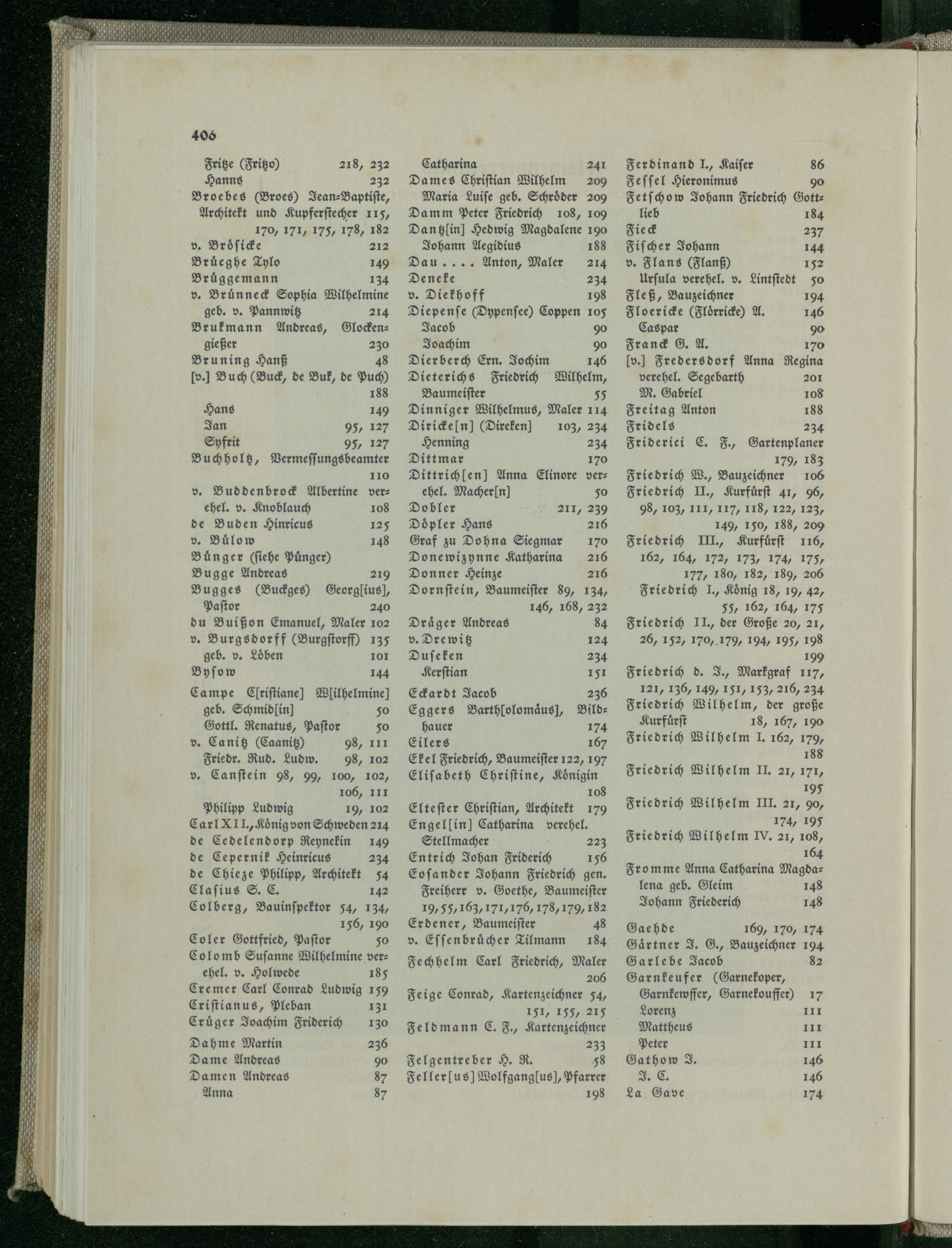 Eltester Christian, Architekt Engel[ in] Catharina verehel Stellmacher Entrich Johan Friderich Eosander Johann Friedrich Freiherr v. Goethe, Baumeister 19,55,163,171,176, 178, 179 Erdener, Baumeister v. Essenbrücher Tilmann Fechhelm Carl Friedrich, Maler