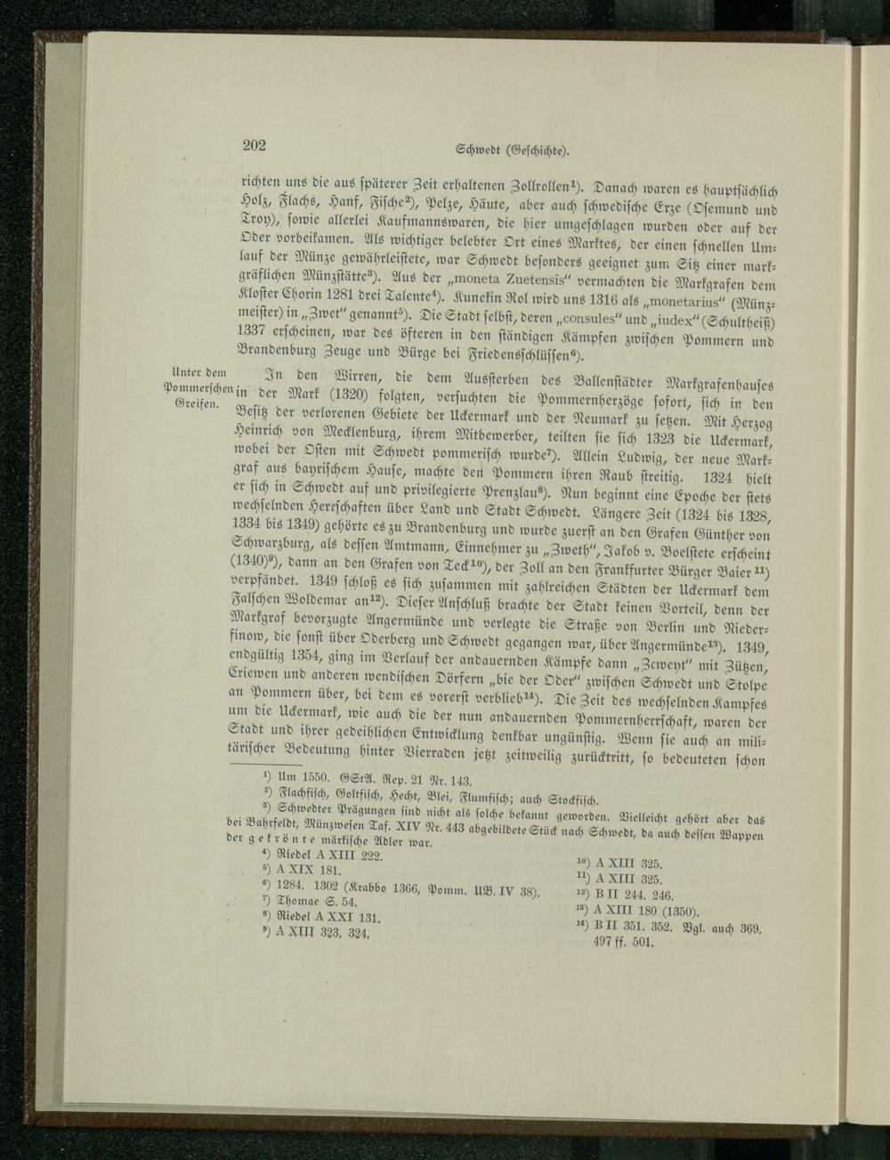 richten uns die aus ſpäterer Zeit erhaltenen Zollrollen). Danach waren es hauptſächlich Holz, Flachs, Hanf, Fiſche?), Pelze, Häute, aber auch ſchwediſche Erze(Oſemund und Troy), ſowie allerlei Kaufmannswaren, die hier umgeſchlagen wurden oder auf der Oder vorbeikamen. Als wichtiger belebter Ort eines Marktes, der einen ſchnellen Um— lauf der Münze gewährleiſtete, war Schwedt beſonders geeignet zum Sitz einer mark— gräflichen Münzſtättes). Aus der„moneta Zuetensis“ vermachten die Markgrafen dem Kloſter Chorin 1281 drei Talente. Kunekin Rol wird uns 1316 als, meiſter) in, Zwet“ genanntèé). Die Stadt ſelbſt, deren„consules” und„iudex“ Schultheiß)