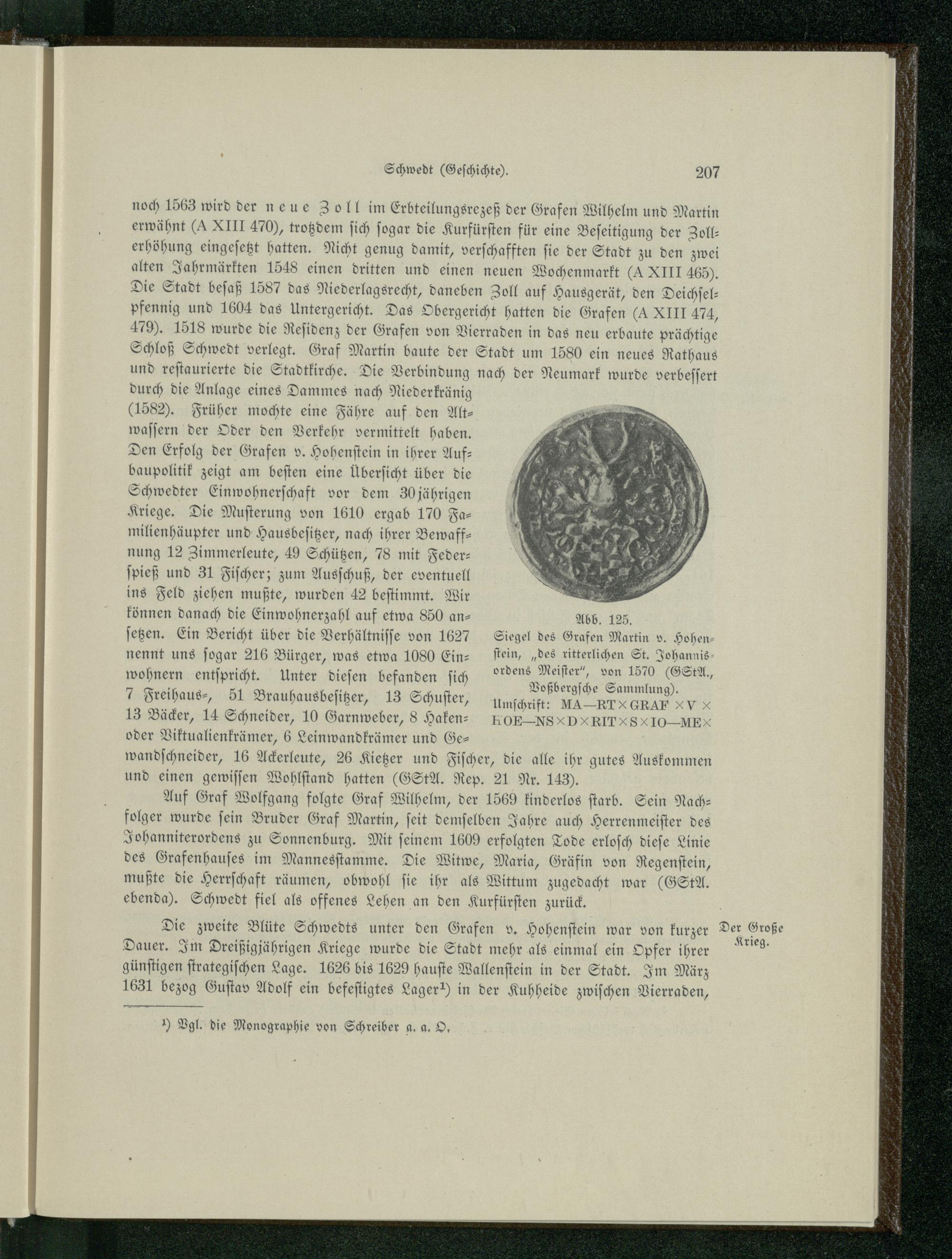 Auf Graf Wolfgang folgte Graf Wilhelm , der 1569 kinderlos ſtarb. Sein Nach— folger wurde ſein Bruder Graf Martin, ſeit demſelben Jahre auch Herrenmeiſter des Johanniterordens zu Sonnenburg. Mit feinem 1609 erfolgten Tode erloſch dieſe Linie des Grafenhauſes im Mannesſtamme. Die Witwe, Maria, Gräfin von Regenſtein, mußte die Herrſchaft räumen, obwohl ſie ihr als Wittum zugedacht war(GSM. ebenda). Schwedt fiel als offenes Lehen an den Kurfürſten zurück.