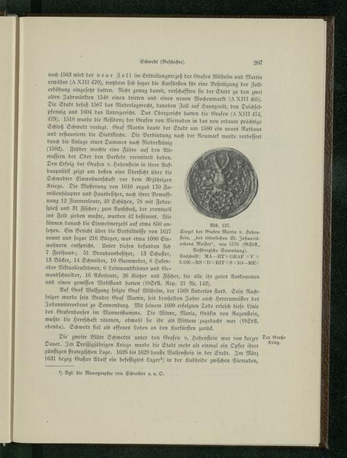 noch 1563 wird der neue Zoll im Erbteilungsrezeß der Grafen Wilhelm und Martin erwähnt(à XIII 470, trotzdem ſich ſogar die Kurfürſten für eine Beſeitigung der Zoll— erhöhung eingeſetzt hatten. Nicht genug damit, verſchafften ſie der Stadt zu den zwei alten Jahrmärkten 1548 einen dritten und einen neuen Wochenmarkt(A XIII 465. Die Stadt beſaß 1587 das Niederlagsrecht, daneben Zoll auf Hausgerät, den Deichſel— pfennig und 1604 das Untergericht. Das Obergericht hatten die Grafen (A XIII 474, 479). 1518 wurde die Reſidenz der Grafen von Vierraden in das neu erbaute prächtige Schloß Schwedt verlegt. Graf Martin baute der Stadt um 1680 ein neues Rathaus und reſtaurierte die Stadtkirche. Die Verbindung nach der Neumark wurde verbeſſert durch die Anlage eines Dammes nach Niederkränig (1582). Früher mochte eine Fähre auf den Alt— waſſern der Oder den Verkehr vermittelt haben. Den Erfolg der Grafen v. Hohenſtein in ihrer Aufbaupolitik zeigt am beſten eine Überſicht über die Schwedter Einwohnerſchaft vor dem 30 jährigen Kriege. Die Muſterung von 1610 ergab 170 Fa— milienhäupter und Hausbeſitzer, nach ihrer Bewaffnung 12 Zimmerleute, 49 Schützen, 78 mit Feder— ſpieß und 31 Fiſcher; zum Ausſchuß, der eventuell ins Feld ziehen mußte, wurden 42 beſtimmt. Wir können danach die Einwohnerzahl auf etwa 850 an— Abb. 1265.