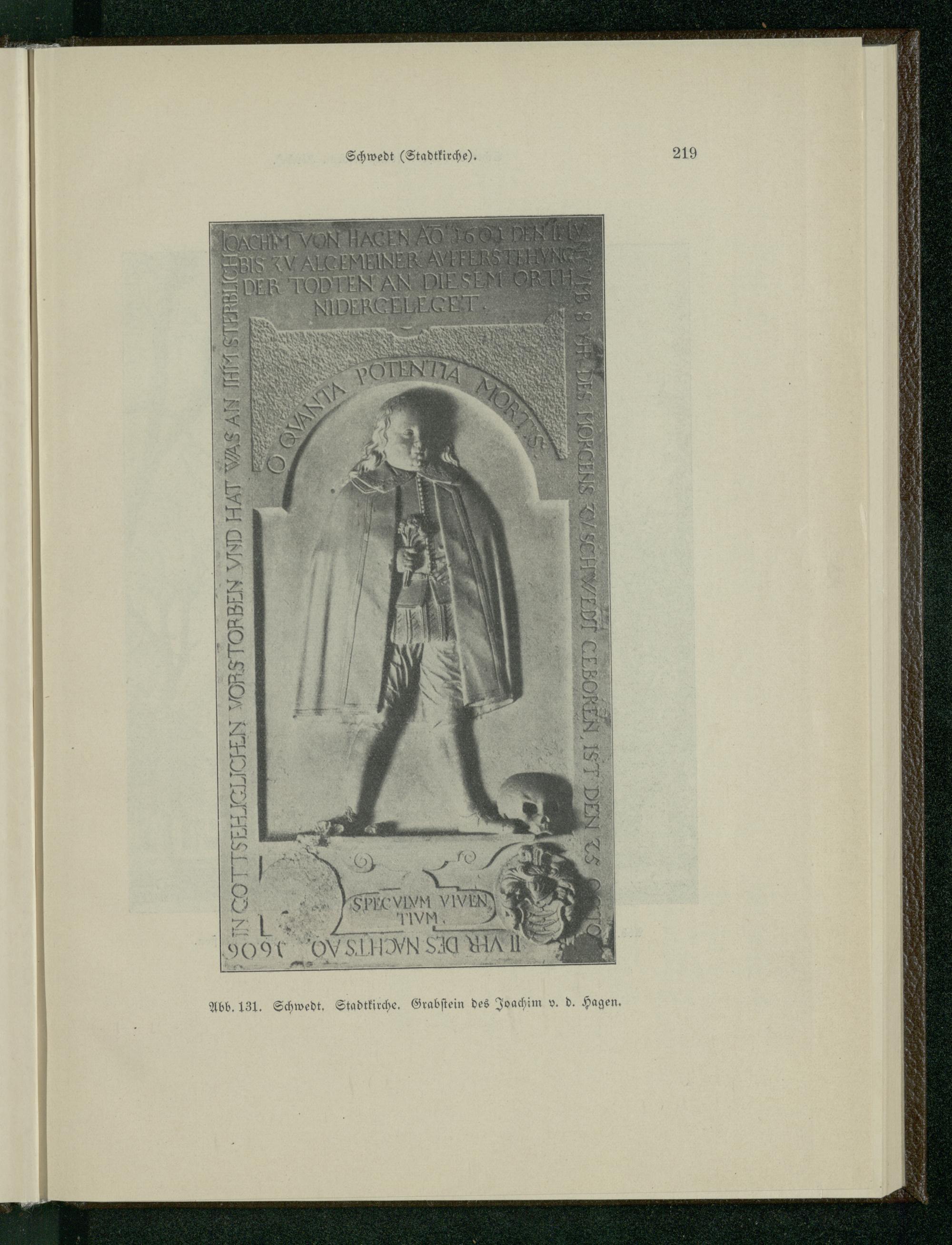 219 Schwedt(Stadtkirche). gr ö . VINM VIVE Vr D ,,,, eme ——— Grabſtein des Joachim v. d. Hagen. ſtadtkirche. S Schwedt. Abb. 131.