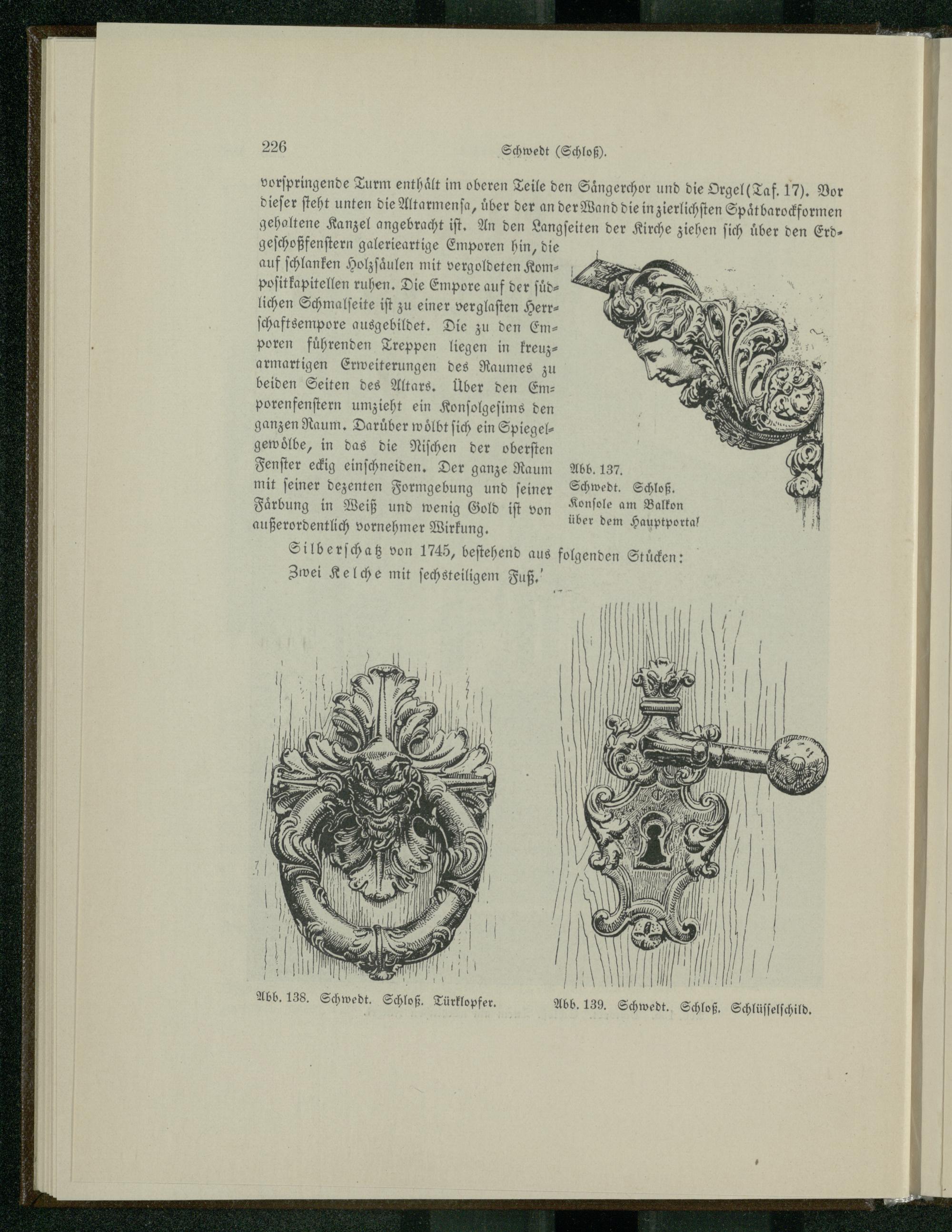geſchoßfenſtern galerieartige Emporen hin, die auf ſchlanken Holzſaͤulen mit vergoldeten Kom— poſitkapitellen ruhen. Die Empore auf der ſuͤdlichen Schmalſeite iſt zu einer verglaſten Herrſchaftsempore ausgebildet. Die zu den Em— poren fuͤhrenden Treppen liegen in kreuzarmartigen Erweiterungen des Raumes zu beiden Seiten des Altars. Über den Em— porenfenſtern umzieht ein Konſolgeſims den ganzen Raum. Daruͤber woͤlbt ſich ein Spiegelgewoͤlbe, in das die Niſchen der oberſten Fenſter eckig einſchneiden. Der ganze Raum mit ſeiner dezenten Formgebung und ſeiner Faͤrbung in Weiß und wenig Gold iſt von außerordentlich vornehmer Wirkung. Silberſchatz von 1745, beſtehend aus