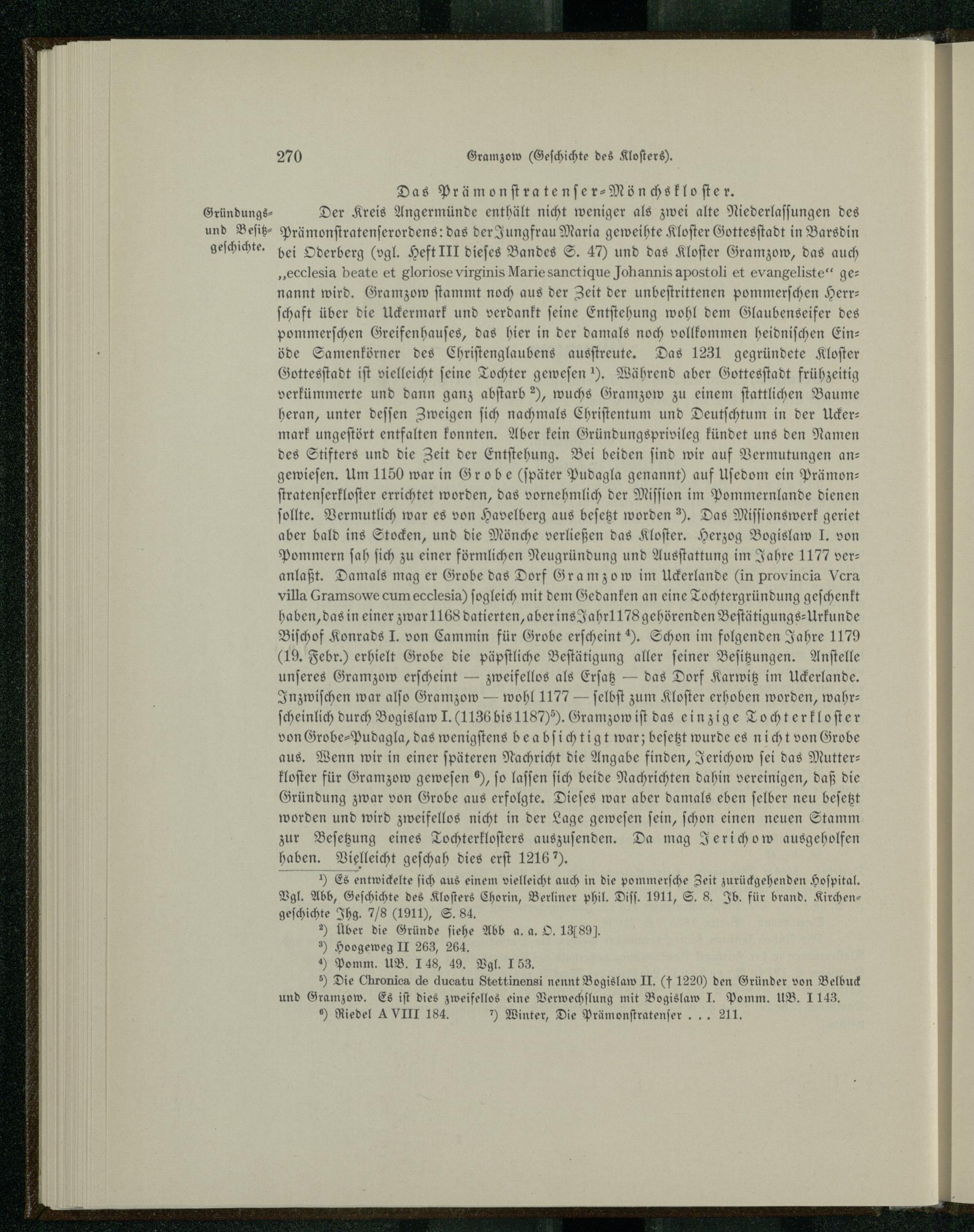 Der Kreis Angermünde enthält nicht weniger als zwei alte Niederlaſſungen des Prämonſtratenſerordens : das der Jungfrau Maria geweihte Kloſter Gottesſtadt in Barsdin bei Oderberg (vgl. Heft II dieſes Bandes S. 47 und das Kloſter Gramzow , das auch „ecclesia beate et gloriose virginis Marie sanctique Johannis apostoli et evangeliste“ genannt wird. Gramzow ſtammt noch aus der Zeit der unbeſtrittenen pommerſchen Herr— ſchaft über die Uckermark und verdankt ſeine Entſtehung wohl dem Glaubenseifer des pommerſchen Greifenhauſes, das hier in der damals noch vollkommen heidniſchen Ein— öde Samenkörner des Chriſtenglaubens ausſtreute. Das 1231 gegründete Kloſter Gottesſtadt iſt vielleicht ſeine Tochter geweſen 1). Während aber Gottesſtadt frühzeitig verkümmerte und dann ganz abſtarb?), wuchs Gramzow zu einem ſtattlichen Baume heran, unter deſſen Zweigen ſich nachmals Chriſtentum und Deutſchtum in der Ucker— mark ungeſtört entfalten konnten. Aber kein Gründungsprivileg kündet uns den Namen des Stifters und die Zeit der Entſtehung. Bei beiden ſind wir auf Vermutungen an— gewieſen. Um 1150 war in Grobe(ſpäter Pudagla genannt) auf Uſedom ein Prämonſtratenſerkloſter errichtet worden, das vornehmlich der Miſſion im Pommernlande dienen ſollte. Vermutlich war es von Havelberg aus beſetzt worden 35. Das Miſſionswerk geriet aber bald ins Stocken, und die Mönche verließen das Kloſter. Herzog Bogislaw J. von Pommern ſah ſich zu einer förmlichen Neugründung und Ausſtattung im Jahre 1177 ver: anlaßt. Damals mag er Grobe das Dorf Gramzow im Uckerlande(in provincia Vera villa Gramsowe cum ecclesia) ſogleich mit dem Gedanken an eine Tochtergründung geſchenkt haben, das in einer zwar 1168 datierten, aber ins Jahr 178 gehörenden Beſtätigungs-Urkunde Biſchof Konrads J. von Cammin für Grobe erſcheint. Schon im folgenden Jahre 1179 (19. Febr.) erhielt Grobe die päpſtliche Beſtätigung aller ſeiner Beſitzungen. Anſtelle unſeres Gramzow erſcheint— zweifellos als Erſatz— das Dorf Karwitz im Uckerlande. Inzwiſchen war alſo Gramzow — wohl 1177— ſelbſt zum Kloſter erhoben worden, wahr— ſcheinlich durch Bogislaw J.(1136 bis 1187)5). Gramzow iſt das einzige Tochterkloſter von Grobe⸗Pudagla, das wenigſtens beabſichtigt war; beſetzt wurde es nicht von Grobe aus. Wenn wir in einer ſpäteren Nachricht die Angabe finden, Jerichow ſei das Mutter— kloſter für Gramzow geweſen H, fo laſſen ſich beide Nachrichten dahin vereinigen, daß die Gründung zwar von Grobe aus erfolgte. Dieſes war aber damals eben ſelber neu beſetzt worden und wird zweifellos nicht in der Lage geweſen ſein, ſchon einen neuen Stamm zur Beſetzung eines Tochterkloſters auszuſenden. Da mag Jerichow ausgeholfen haben. Vielleicht geſchah dies erſt 12167).