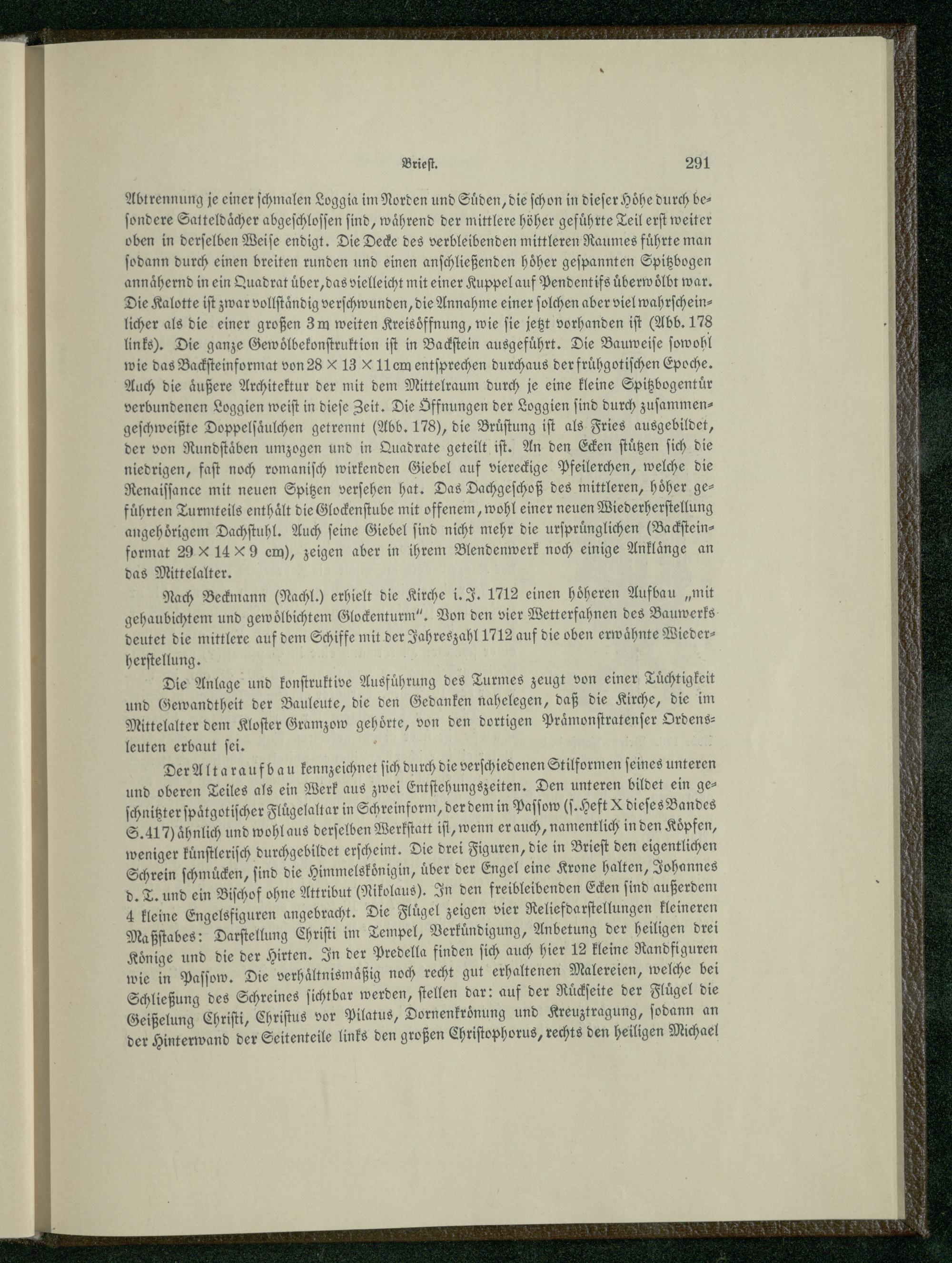 Der Alt araufb au kennzeichnet[ich durch die verſchiedenen Stilformen ſeines unteren und oberen Teiles als ein Werk aus zwei Entſtehungszeiten. Den unteren bildet ein geſchnitzter ſpaͤtgötiſcher Fluͤgelaltar in Schreinform, der dem in Paſſow(ſ. Heft X dieſes Bandes S.417) ähnlich und wohl aus derſelben Werkſtatt iſt, wenn er auch, namentlich in den Köpfen, weniger kuͤnſtleriſch durchgebildet erſcheint. Die drei Figuren, die in Brieſt den eigentlichen Schrein ſchmuͤcken, ſind die Himmelskoͤnigin, uͤber der Engel eine Krone halten, Johannes d. T. und ein Biſchof ohne Attribut(Nikolaus). In den freibleibenden Ecken ſind außerdem 4 kleine Engelsfiguren angebracht. Die Fluͤgel zeigen vier Reliefdarſtellungen kleineren Maßſtabes: Darſtellung Chriſti im Tempel, Verkuͤndigung, Anbetung der heiligen drei Könige und die der Hirten. In der Predella finden ſich auch hier 12 kleine Randfiguren wie in Paſſow. Die verhaͤltnismaͤßig noch recht gut erhaltenen Malereien, welche bei Schließung des Schreines ſichtbar werden, ſtellen dar: auf der Ruͤckſeite der Flügel die Geißelung Chriſti, Chriſtus vor Pilatus , Dornenkroͤnung und Kreuztragung, ſodann an der Hinterwand der Seitenteile links den großen Chriſtophorus, rechts den heiligen Michael