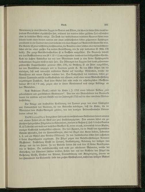 Abtrennung je einer ſchmalen Loggia im Norden und Suͤden, die ſchon in dieſer Hohe durch beſondere Satteldaͤcher abgeſchloſſen find, waͤhrend der mittlere höher geführte Teil erſt weiter oben in derſelben Weiſe endigt. Die Decke des verbleibenden mittleren Raumes fuͤhrte man ſodann durch einen breiten runden und einen anſchließenden hoͤher geſpannten Spitzbogen annaͤhernd in ein Quadrat uͤber, das vielleicht mit einer Kuppel auf Pendentifs uͤberwoͤlbt war. Die Kalotte iſt zwar vollſtaͤndig verſchwunden, die Annahme einer ſolchen aber viel wahrſcheinlicher als die einer großen 3m weiten Kreisoͤffnung, wie ſie jetzt vorhanden iſt(Abb. 178 links). Die ganze Gewoͤlbekonſtruktion iſt in Bachſtein ausgeführt. Die Bauweiſe ſowohl wie das Backſteinformat von 28* 13* 110m entſprechen durchaus der fruͤhgotiſchen Epoche. Auch die aͤußere Architektur der mit dem Mittelraum durch je eine kleine Spitzbogentuͤr verbundenen Loggien weiſt in dieſe Zeit. Die Öffnungen der Loggien[ind durch zuſammengeſchweißte Doppelſaͤulchen getrennt(Abb. 178), die Bruͤſtung iſt als Fries ausgebildet, der von Rundſtaͤben umzogen und in Quadrate geteilt iſt. An den Ecken ſtuͤtzen ſich die niedrigen, faſt noch romaniſch wirkenden Giebel auf viereckige Pfeilerchen, welche die Renaiſſance mit neuen Spitzen verſehen hat. Das Dachgeſchoß des mittleren, höher geführten Turmteils enthält die Glockenſtube mit offenem, wohl einer neuen Wiederherſtellung angehoͤrigem Dachſtuhl. Auch feine Giebel find nicht mehr die urſpruͤnglichen(Backſtein= format 29* 14*9 em), zeigen aber in ihrem Blendenwerk noch einige Anklaͤnge an das Mittelalter.