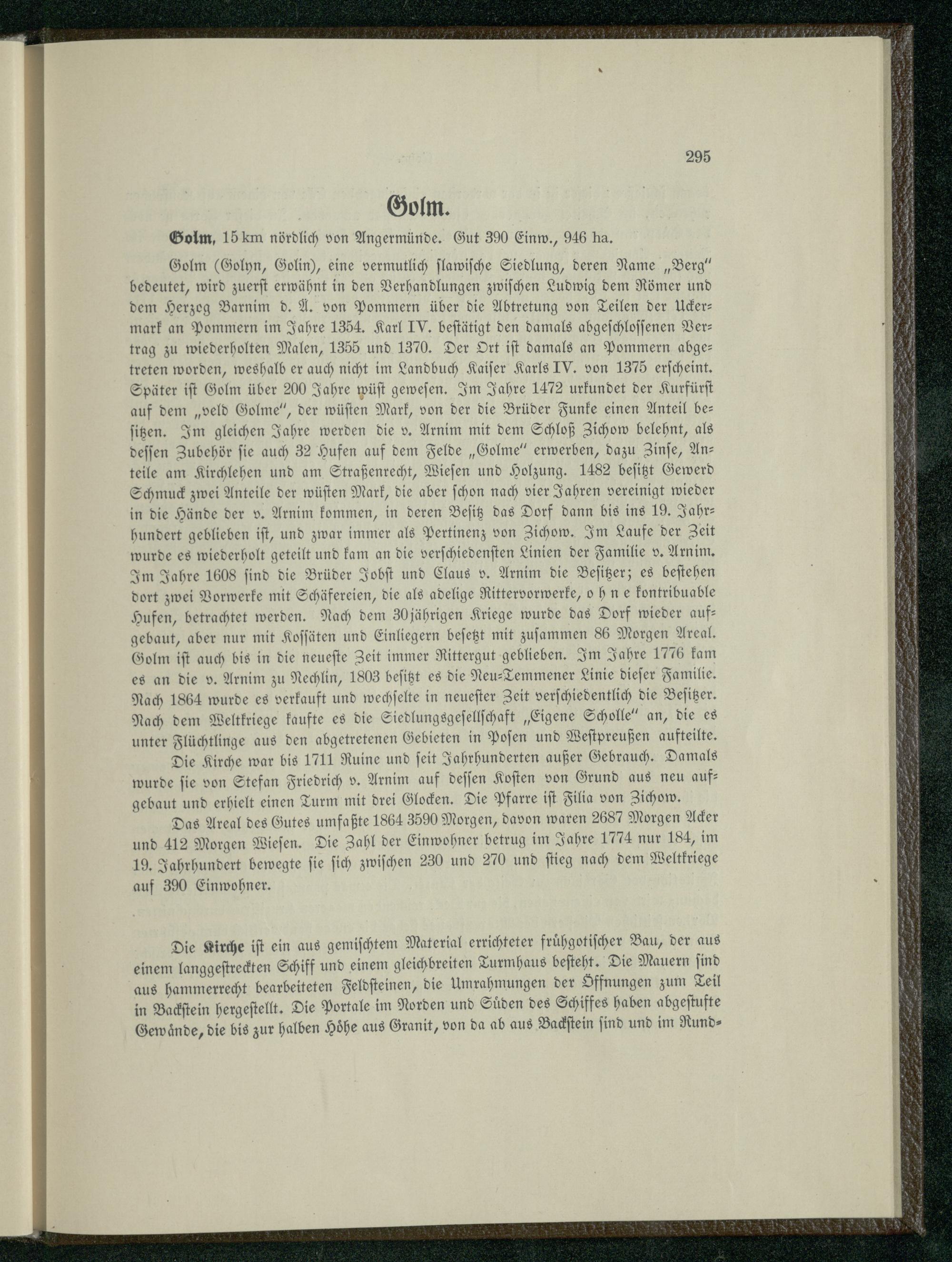 Golm(Golyn, Golin), eine vermutlich ſlawiſche Siedlung, deren Name„Berg “ bedeutet, wird zuerſt erwähnt in den Verhandlungen zwiſchen Ludwig dem Römer und dem Herzeg Barnim d. A. von Pommern über die Abtretung von Teilen der Uckermark an Pommern im Jahre 1354. Karl IV. beſtätigt den damals abgeſchloſſenen Ver— trag zu wiederholten Malen, 1355 und 1370. Der Ort iſt damals an Pommern abge: treten worden, weshalb er auch nicht im Landbuch Kaiſer Karls IV. von 1375 erſcheint. Später iſt Golm über 200 Jahre wüſt geweſen. Im Jahre 1472 urkundet der Kurfürſt auf dem„veld Golme“, der wüſten Mark, von der die Brüder Funke einen Anteil beſitzen. Im gleichen Jahre werden die v. Arnim mit dem Schloß Zichow belehnt, als deſſen Zubehör fie auch 32 Hufen auf dem Felde„Golme“ erwerben, dazu Zinſe, Anteile am Kirchlehen und am Straßenrecht, Wieſen und Holzung. 1482 beſitzt Gewerd Schmuck zwei Anteile der wüſten Mark, die aber ſchon nach vier Jahren vereinigt wieder in die Hände der v. Arnim kommen, in deren Beſitz das Dorf dann bis ins 19. Jahrhundert geblieben iſt, und zwar immer als Pertinenz von Zichow . Im Laufe der Zeit wurde es wiederholt geteilt und kam an die verſchiedenſten Linien der Familie v. Arnim. Im Jahre 1608 ſind die Brüder Jobſt und Elaus v. Arnim die Beſitzer; es beſtehen dort zwei Vorwerke mit Schäfereien, die als adelige Rittervorwerke, o h me kontribuable Hufen, betrachtet werden. Nach dem 30 jährigen Kriege wurde das Dorf wieder aufgebaut, aber nur mit Koſſäten und Einliegern beſetzt mit zuſammen 86 Morgen Areal. Golm iſt auch bis in die neueſte Zeit immer Rittergut geblieben. Im Jahre 1776 kam es an die v. Arnim zu Nechlin, 1803 beſitzt es die Neu-Temmener Linie dieſer Familie. Nach 1864 wurde es verkauft und wechſelte in neueſter Zeit verſchiedentlich die Beſitzer. Nach dem Weltkriege kaufte es die Siedlungsgeſellſchaft„Eigene Scholle“ an, die es unter Flüchtlinge aus den abgetretenen Gebieten in Poſen und Weſtpreußen aufteilte.