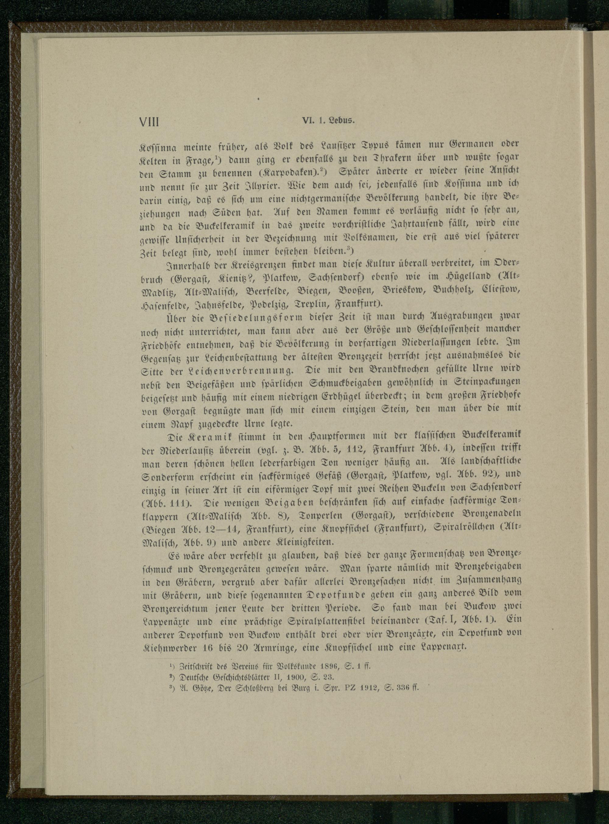 Koſſinna meinte früher, als Volk des Lauſitzer Typus kämen nur Germanen oder Kelten in Frage,) dann ging er ebenfalls zu den Thrakern über und wußte ſogar den Stamm zu benennen(Karpodaken).“) Später änderte er wieder ſeine Anſicht und nennt ſie zur Zeit Illyrier. Wie dem auch ſei, jedenfalls ſind Koſſinna und ich darin einig, daß es ſich um eine nichtgermaniſche Bevölkerung handelt, die ihre Beziehungen nach Süden hat. Auf den Namen kommt es vorläufig nicht ſo ſehr an, und da die Buckelkeramik in das zweite vorchriſtliche Jahrtauſend fällt, wird eine gewiſſe Unſicherheit in der Bezeichnung mit Volksnamen, die erſt aus viel ſpäterer Zeit belegt ſind, wohl immer beſtehen bleiben.);