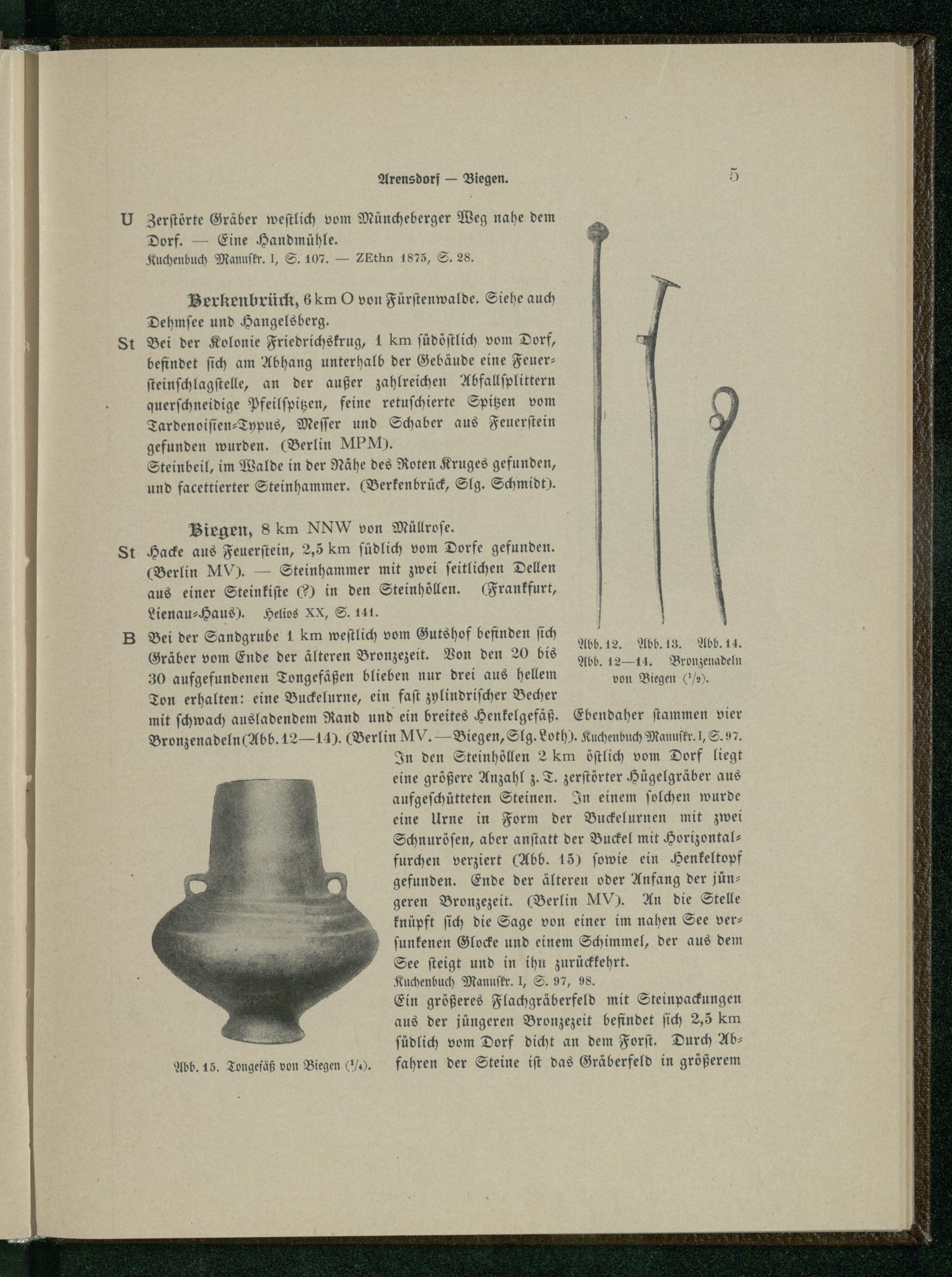 B Bei der Sandgrube 1 km weſtlich vom Gutshof befinden ſich k Gräber vom Ende der älteren Bronzezeit. Von den 20 bis 9166. 4,| 2 30 aufgefundenen Tongefäßen blieben nur drei aus hellem von Biegen(2). Ton erhalten: eine Buckelurne, ein faſt zylindriſcher Becher mit ſchwach ausladendem Rand und ein breites Henkelgefäß. Ebendaher ſtammen vier Bronzenadeln(Abb. 12— 14).(Berlin MV. — Biegen, Slg. Loth). Kuchenbuch Manuſkr. I, S. 97.