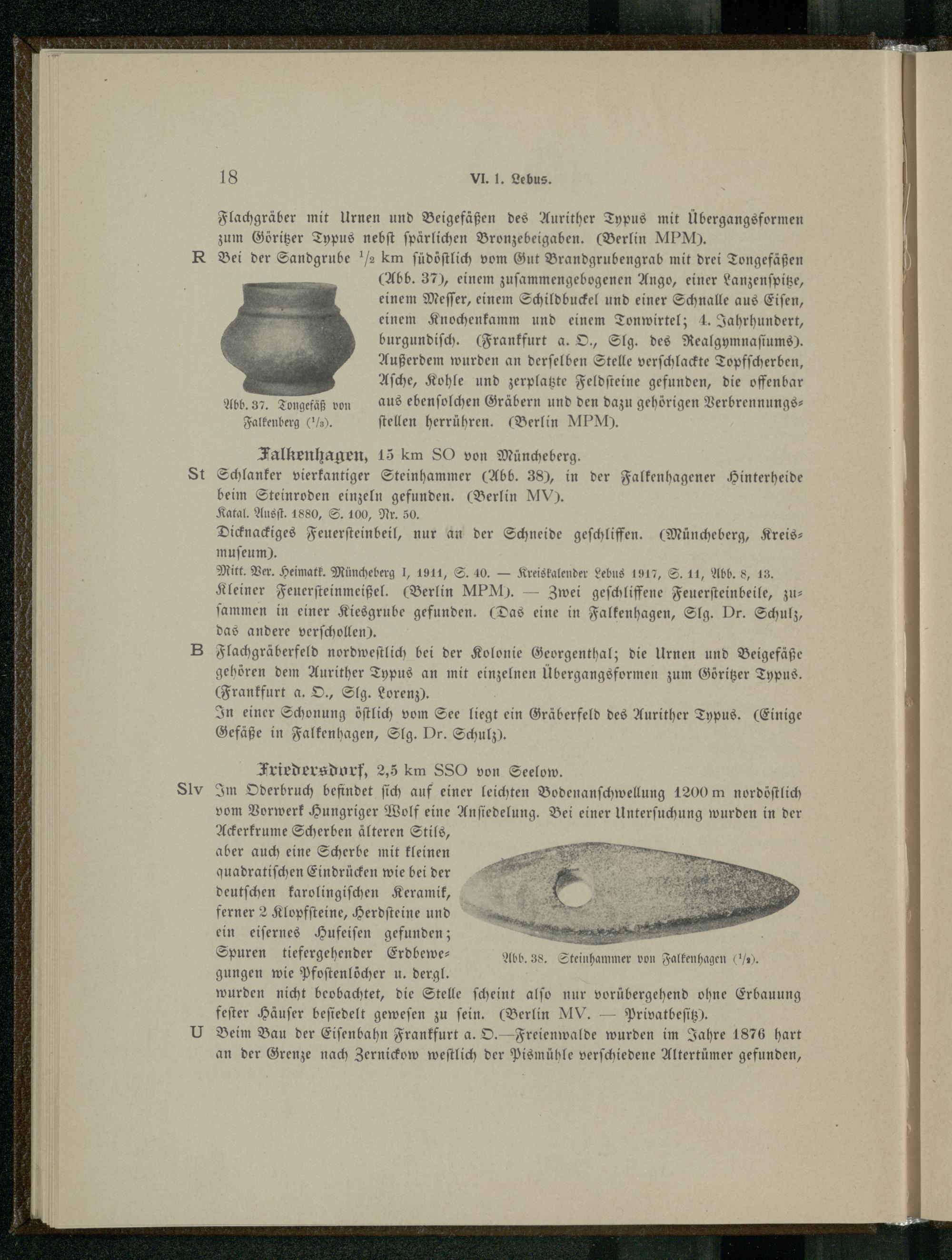 Falkenhagen , 15 km SO von Müncheberg . Schlanker vierkantiger Steinhammer(Abb. 38), in der Falkenhagener Hinterheide beim Steinroden einzeln gefunden.(Berlin MV ). Katal. Ausſt. 1880, S. 100, Nr. 50. Dicknackiges Feuerſteinbeil, nur an der Schneide geſchliffen.(Müncheberg , Kreismuſeum). Mitt. Ver. Heimatk. Müncheberg 1, 1911, S. 10.— Kreiskalender Lebus 1917, S. 11, Abb. 8, 143. Kleiner Feuerſteinmeißel.(Berlin MPM).— Zwei geſchliffene Feuerſteinbeile, zuſammen in einer Kiesgrube gefunden.(Das eine in Falkenhagen, Slg. Dr. Schulz, das andere verſchollen). Flachgräberfeld nordweſtlich bei der Kolonie Georgenthal ; die Urnen und Beigefäße gehören dem Aurither Typus an mit einzelnen Übergangsformen zum Göritzer Typus. (Frankfurt a. O., Slg. Lorenz). In einer Schonung öſtlich vom See liegt ein Gräberfeld des Aurither Typus.(Einige Gefäße in Falkenhagen , Slg. Dr. Schulz).
